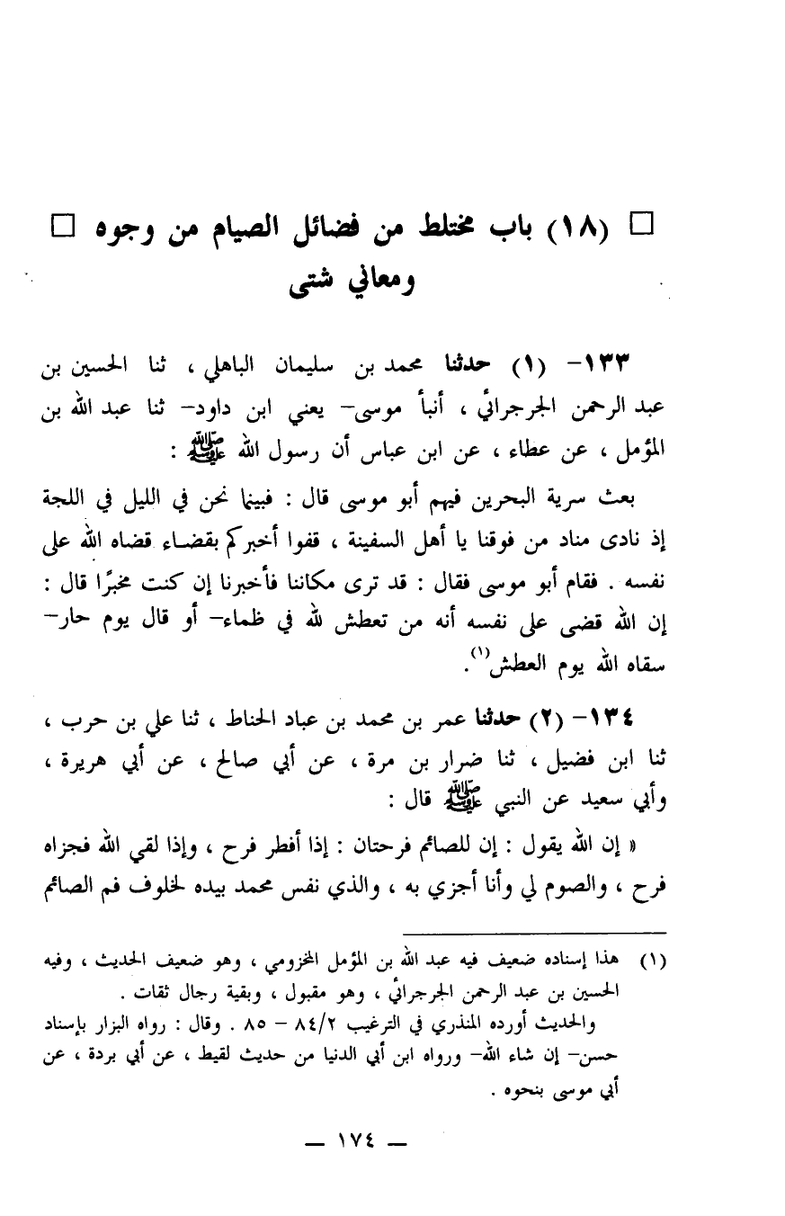 133 - حَدَّثَنَا مُحَمَّدُ بْنُ سُلَيْمَانَ الْبَاهِلِيُّ، ثنا الْحُسَيْنُ بْنُ عَبْدِ الرَّحْمَنِ الْجَرْجَرَائِيُّ، أَنْبَأَ مُوسَى يَعْنِي ابْنَ دَاوُدَ، ثنا عَبْدُ اللَّهِ بْنُ الْمُؤَمَّلِ، عَنْ عَطَاءٍ، عَنِ ابْنِ عَبَّاسٍ، أَنَّ رَسُولَ اللَّهِ صَلَّى اللَّهُ عَلَيْهِ وَسَلَّمَ " بَعَثَ سَرِيَّةَ الْبَحْرَيْنِ فِيهِمْ أَبُو مُوسَى قَالَ: فَبَيْنَمَا نَحْنُ فِي اللَّيْلِ فِي اللُّجَّةِ إِذْ نَادَى مُنَادٍ مِنْ فَوْقِنَا يَا أَهْلَ السَّفِينَةِ، قِفُوا أُخْبِرُكُمْ بِقَضَاءٍ قَضَاهُ اللَّهُ عَلَى نَفْسِهِ. فَقَامَ أَبُو مُوسَى، فَقَالَ: قَدْ تَرَى مَكَانَنَا فَأَخْبِرْنَا إِنْ كُنْتَ مُخْبِرًا قَالَ: إِنَّ اللَّهَ قَضَى عَلَى نَفْسِهِ أَنَّهُ مَنْ تَعَطَّشَ لِلَّهِ فِي ظَمَاءٍ، - أَوْ قَالَ: يَوْمٍ حَارٍّ - سَقَاهُ اللَّهُ يَوْمَ الْعَطَشِ "