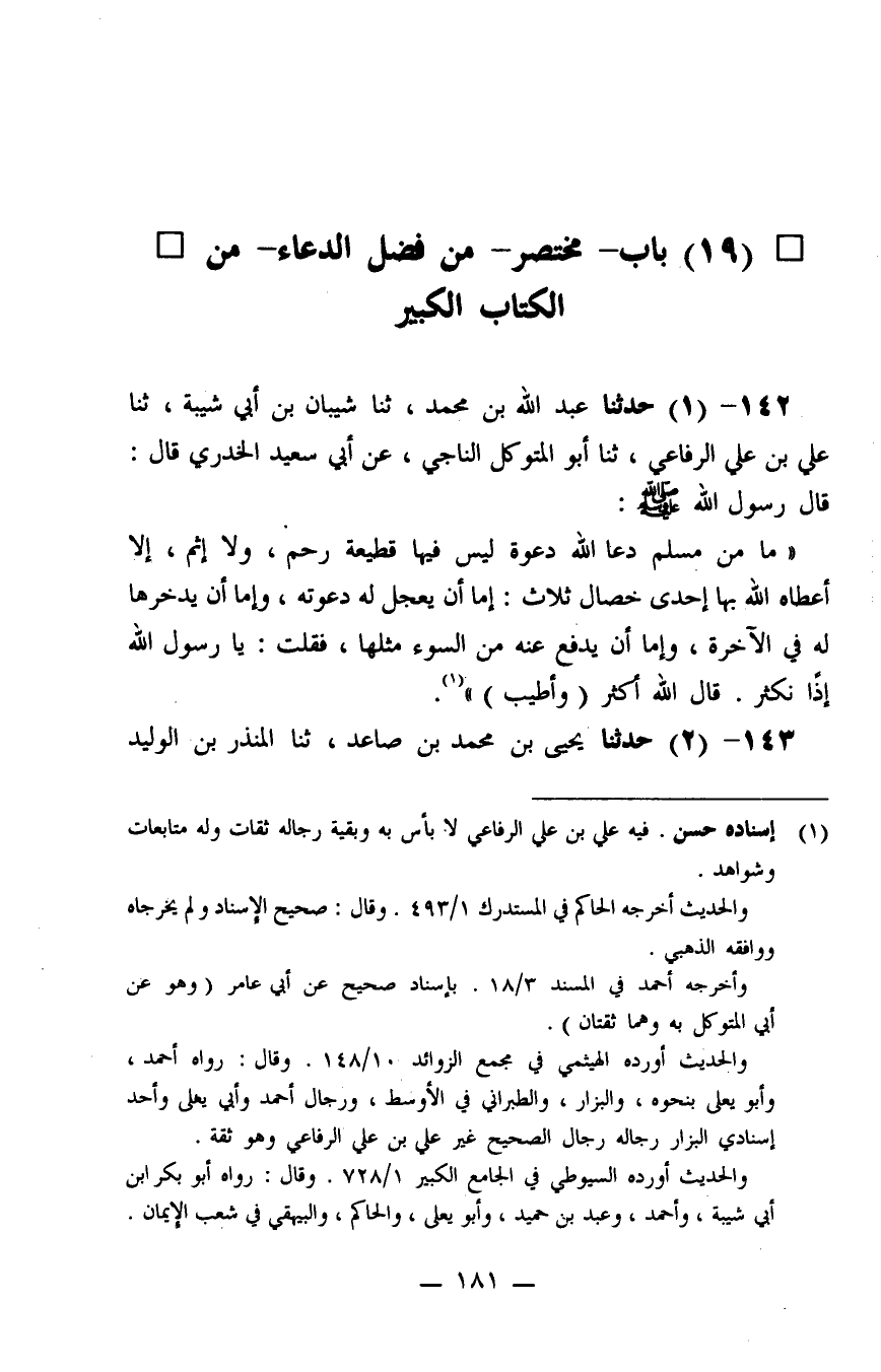 142 - حَدَّثَنَا عَبْدُ اللَّهِ بْنُ مُحَمَّدٍ، ثنا شَيْبَانُ بْنُ أَبِي شَيْبَةَ، ثنا عَلِيُّ بْنُ عَلِيٍّ الرِّفَاعِيُّ، ثنا أَبُو الْمُتَوَكِّلِ النَّاجِيُّ، عَنْ أَبِي سَعِيدٍ الْخُدْرِيِّ، قَالَ: قَالَ رَسُولُ اللَّهِ صَلَّى اللَّهُ عَلَيْهِ وَسَلَّمَ: " مَا مِنْ مُسْلِمٍ دَعَا اللَّهَ دَعْوَةً لَيْسَ فِيهَا قَطِيعَةُ رَحِمٍ، وَلَا إِثْمٌ، إِلَّا أَعْطَاهُ اللَّهُ بِهَا إِحْدَى خِصَالٍ ثَلَاثٍ: إِمَّا أَنْ يُعَجِّلَ لَهُ دَعْوَتَهُ، وَإِمَّا أَنْ يَدَّخِرَهَا لَهُ فِي الْآخِرَةِ، وَإِمَّا أَنْ يَدْفَعَ عَنْهُ مِنَ السُّوءِ مِثْلَهَا، فقُلْتُ: يَا رَسُولَ اللَّهِ إِذًا نُكْثِرُ. قَالَ اللَّهُ أَكْثَرُ وَأَطْيَبُ "