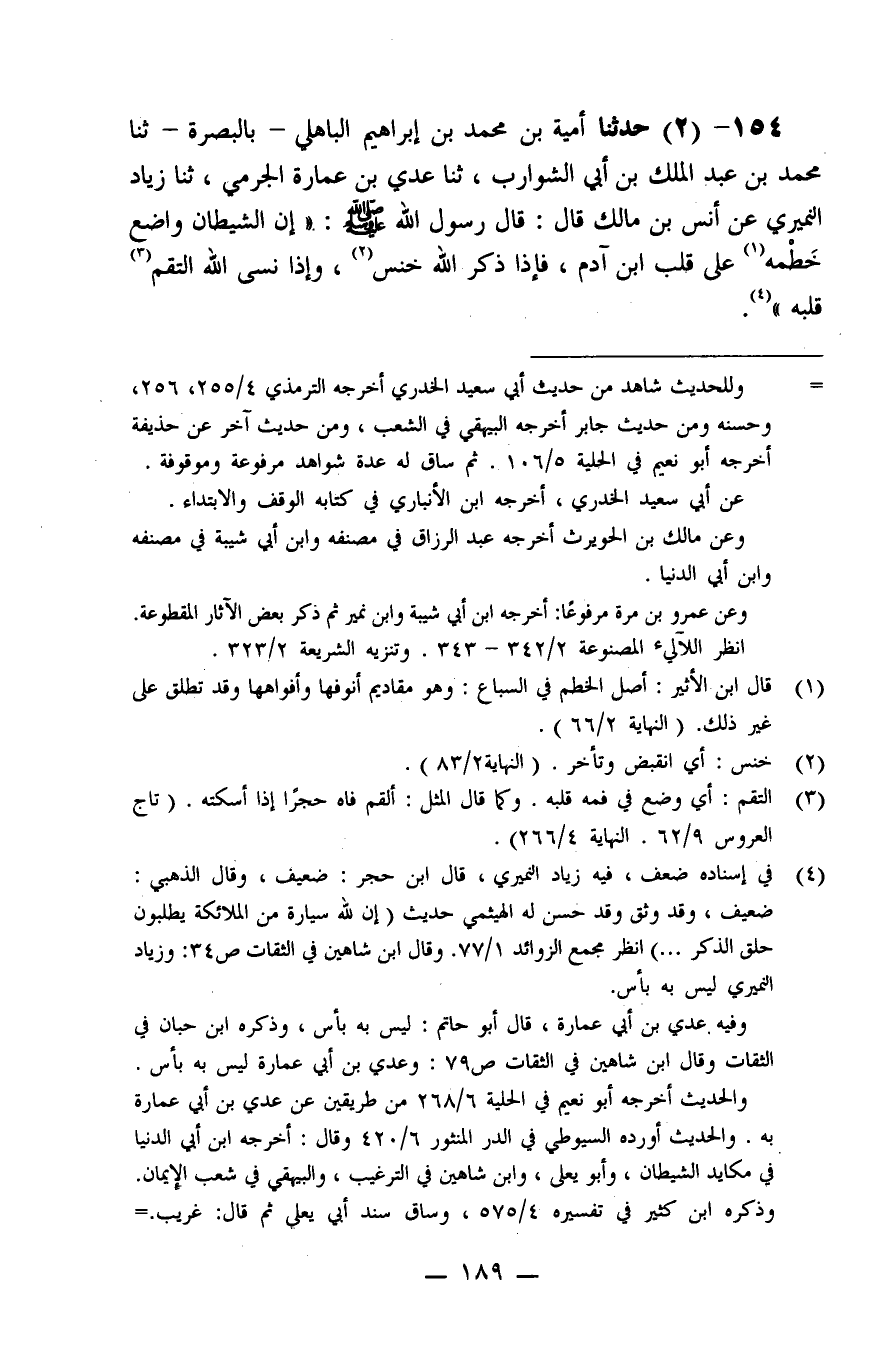 154 - حَدَّثَنَا أُمَيَّةُ بْنُ مُحَمَّدِ بْنِ إِبْرَاهِيمَ الْبَاهِلِيُّ، بِالْبَصْرَةِ، ثنا مُحَمَّدُ بْنُ عَبْدِ الْمَلِكِ بْنِ أَبِي الشَّوَارِبِ، ثنا عَدِيُّ بْنُ عُمَارَةَ الْجَرْمِيُّ، ثنا زِيَادٌ النُّمَيْرِيُّ، عَنْ أَنَسِ بْنِ مَالِكٍ، قَالَ: قَالَ رَسُولُ اللَّهِ صَلَّى اللَّهُ عَلَيْهِ وَسَلَّمَ: «إِنَّ الشَّيْطَانَ وَاضِعٌ خَطْمَهُ عَلَى قَلْبِ ابْنِ آدَمَ، فَإِذَا ذَكَرَ اللَّهَ خَنَسَ، وَإِذَا نَسِيَ اللَّهَ الْتَقَمَ قَلْبَهُ»