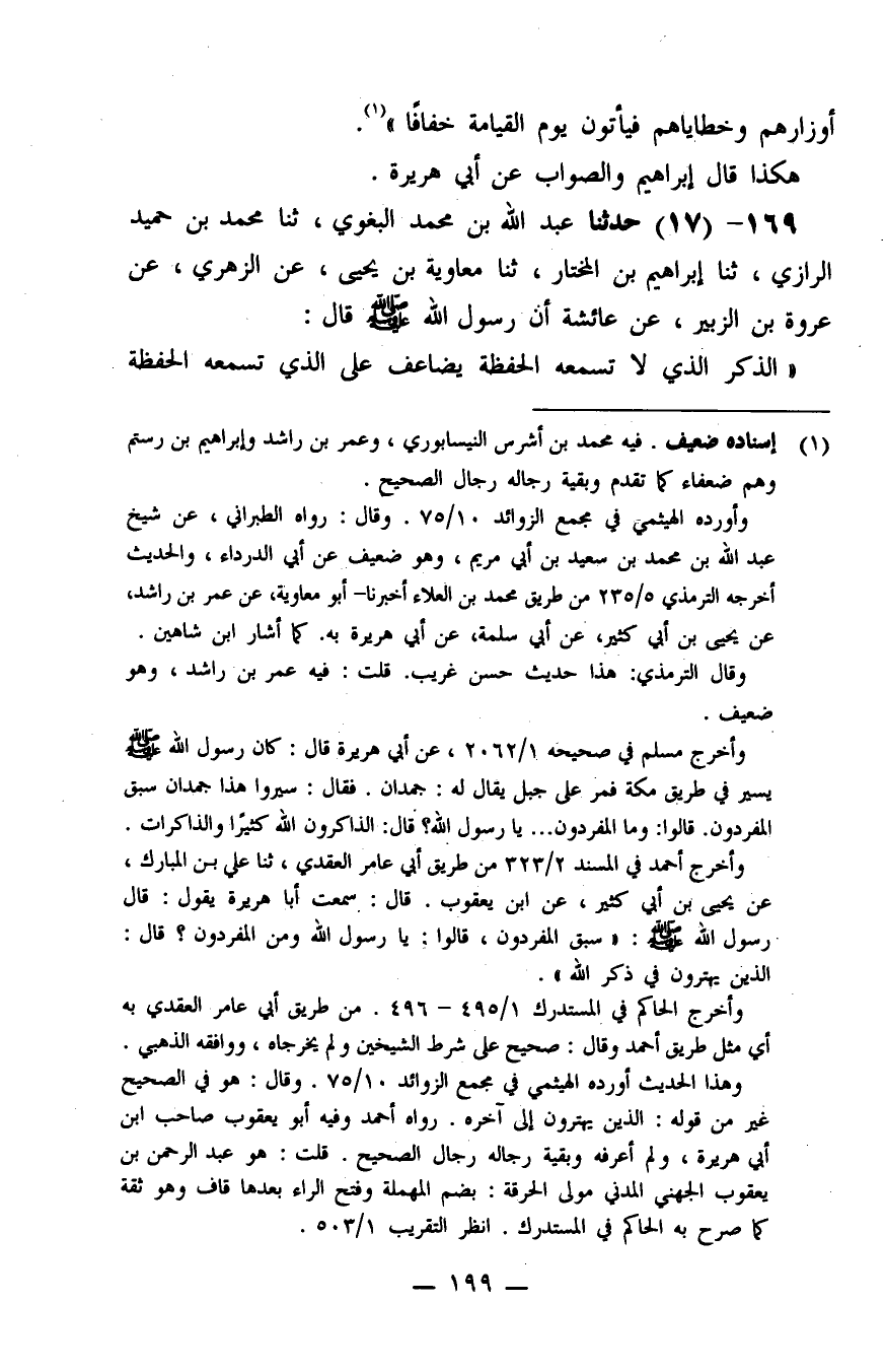 169 - حَدَّثَنَا عَبْدُ اللَّهِ بْنُ مُحَمَّدٍ الْبَغَوِيُّ، ثنا مُحَمَّدُ بْنُ حُمَيْدٍ الرَّازِيُّ، ثنا إِبْرَاهِيمُ بْنُ الْمُخْتَارِ، ثنا مُعَاوِيَةُ بْنُ يَحْيَى، عَنِ الزُّهْرِيِّ، عَنْ عُرْوَةَ بْنِ الزُّبَيْرِ، عَنْ عَائِشَةَ، أَنَّ رَسُولَ اللَّهِ صَلَّى اللَّهُ عَلَيْهِ وَسَلَّمَ قَالَ: «الذِّكْرُ الَّذِي لَا تَسْمَعُهُ الْحَفَظَةُ يُضَاعَفُ عَلَى الَّذِي تَسْمَعُهُ الْحَفَظَةُ بِسَبْعِينَ ضِعْفًا»