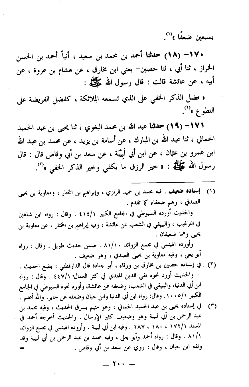 170 - حَدَّثَنَا أَحْمَدُ بْنُ مُحَمَّدِ بْنِ سَعِيدٍ، أَنْبَأَ أَحْمَدُ بْنُ الْحَسَنِ الْخَرَّازُ، ثنا أَبِي، ثنا حُصَيْنٌ يَعْنِي ابْنَ مُخَارِقٍ، عَنْ هِشَامِ بْنِ عُرْوَةَ، عَنْ أَبِيهِ، عَنْ عَائِشَةَ، قَالَتْ: قَالَ رَسُولُ اللَّهِ صَلَّى اللَّهُ عَلَيْهِ وَسَلَّمَ: «فَضْلُ الذِّكْرِ الْخَفِيِّ عَلَى الَّذِي تَسْمَعُهُ الْمَلَائِكَةُ كَفَضْلِ الْفَرِيضَةِ عَلَى التَّطَوُّعِ»