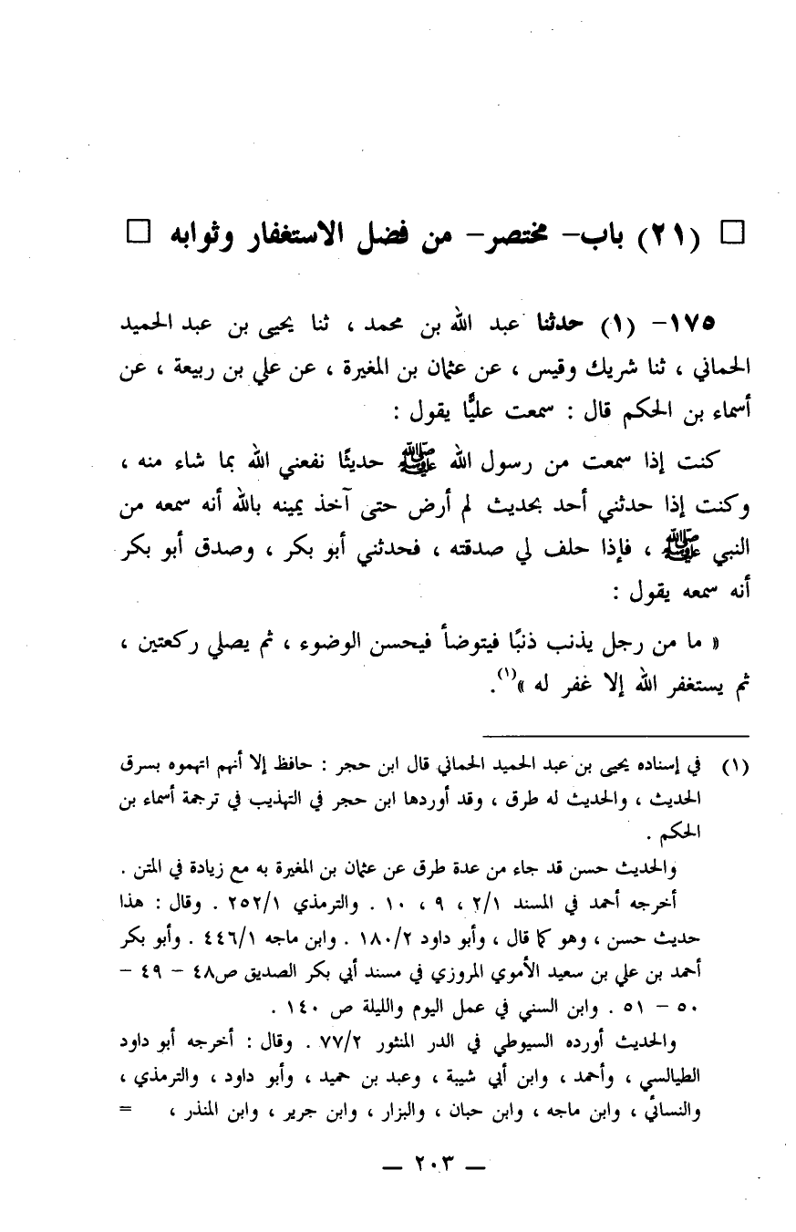 175 - حَدَّثَنَا عَبْدُ اللَّهِ بْنُ مُحَمَّدٍ، ثنا يَحْيَى بْنُ عَبْدِ الْحَمِيدِ الْحِمَّانِيُّ، ثنا شَرِيكٌ، وَقَيْسٌ، عَنْ عُثْمَانَ بْنِ الْمُغِيرَةِ، عَنْ عَلِيِّ بْنِ رَبِيعَةَ، عَنْ أَسْمَاءَ بْنِ الْحَكَمِ، قَالَ: سَمِعْتُ عَلِيًّا، يَقُولُ: كُنْتُ إِذَا سَمِعْتُ مِنَ رَسُولِ اللَّهِ صَلَّى اللَّهُ عَلَيْهِ وَسَلَّمَ حَدِيثًا نَفَعَنِي اللَّهُ بِمَا شَاءَ مِنْهُ، وَكُنْتُ إِذَا حَدَّثَنِي أَحَدٌ بِحَدِيثٍ لَمْ أَرْضَ حَتَّى آخُذَ يَمِينَهُ بِاللَّهِ أَنَّهُ سَمِعَهُ مِنَ النَّبِيِّ صَلَّى اللَّهُ عَلَيْهِ وَسَلَّمَ، فَإِذَا حَلَفَ لِي صَدَّقْتُهُ، فَحَدَّثَنِي أَبُو بَكْرٍ - وَصَدَقَ أَبُو بَكْرٍ - أَنَّهُ سَمِعَهُ يَقُولُ: «مَا مِنْ رَجُلٍ يُذْنِبُ ذَنْبًا فَيَتَوَضَّأُ فَيُحْسِنُ الْوُضُوءَ، ثُمَّ يُصَلِّي رَكْعَتَيْنِ، ثُمَّ يَسْتَغْفِرُ اللَّهَ؛ إِلَّا غُفِرَ لَهُ»