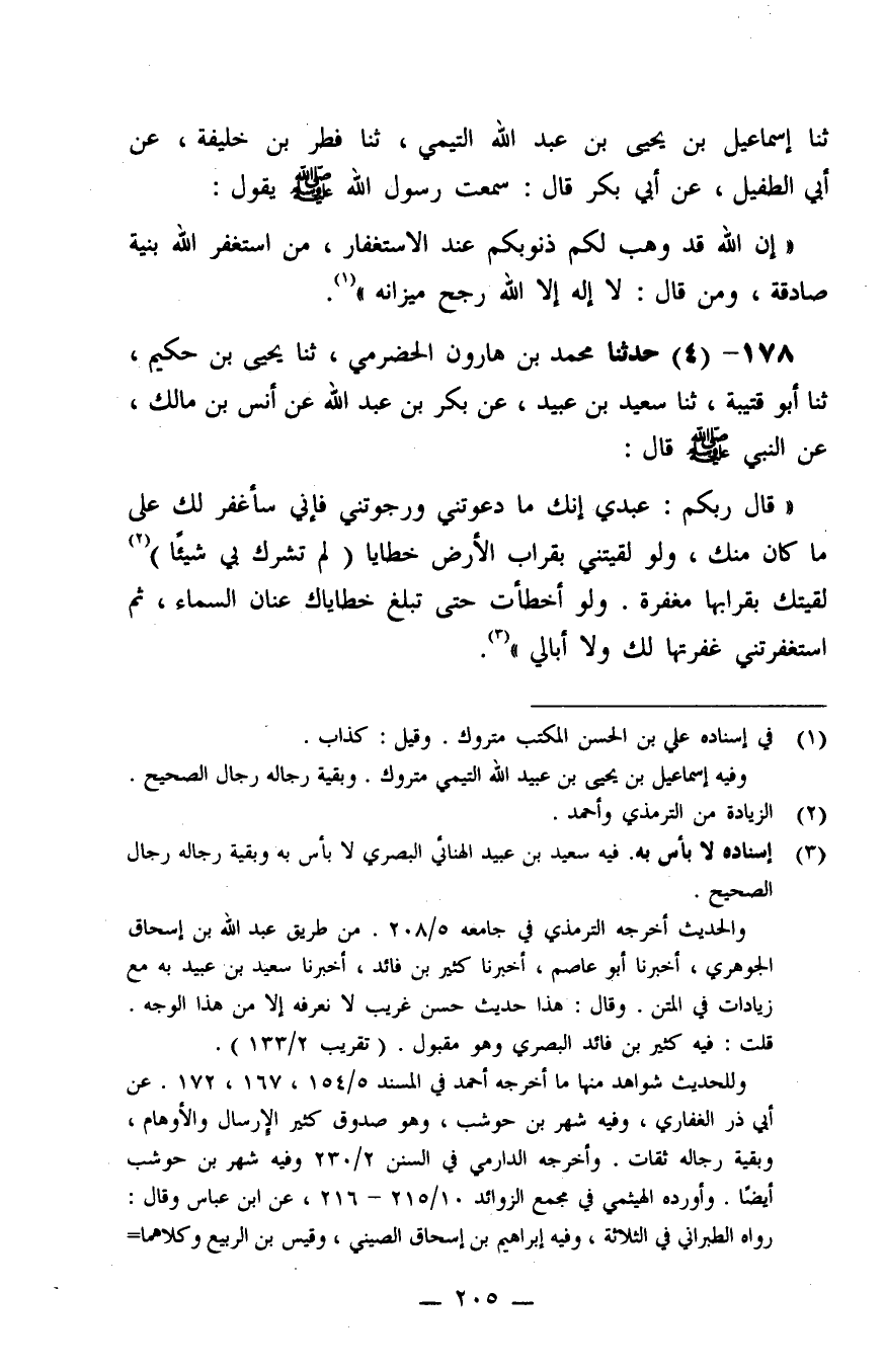 178 - حَدَّثَنَا مُحَمَّدُ بْنُ هَارُونَ الْحَضْرَمِيُّ، ثنا يَحْيَى بْنُ حَكِيمٍ، ثنا أَبُو قُتَيْبَةَ، ثنا سَعِيدُ بْنُ عُبَيْدٍ، عَنْ بَكْرِ بْنِ عَبْدِ اللَّهِ، عَنْ أَنَسِ بْنِ مَالِكٍ، عَنِ النَّبِيِّ صَلَّى اللَّهُ عَلَيْهِ وَسَلَّمَ قَالَ: " قَالَ رَبُّكُمْ: عَبْدِي، إِنَّكَ مَا دَعَوْتَنِي وَرَجَوْتَنِي فَإِنِّي سَأَغْفِرُ لَكَ عَلَى مَا كَانَ مِنْكَ، وَلَوْ لَقِيتَنِي بِقُرَابِ الْأَرْضِ خَطَايَا لَمْ تُشْرِكْ بِي شَيْئًا لَقِيتُكَ بِقُرَابِهَا مَغْفِرَةً، وَلَوْ أَخْطَاتَ حَتَّى تَبْلُغَ خَطَايَاكَ عَنَانَ السَّمَاءِ، ثُمَّ اسْتَغْفَرْتَنِي، غَفَرْتُهَا لَكَ وَلَا أُبَالِي "