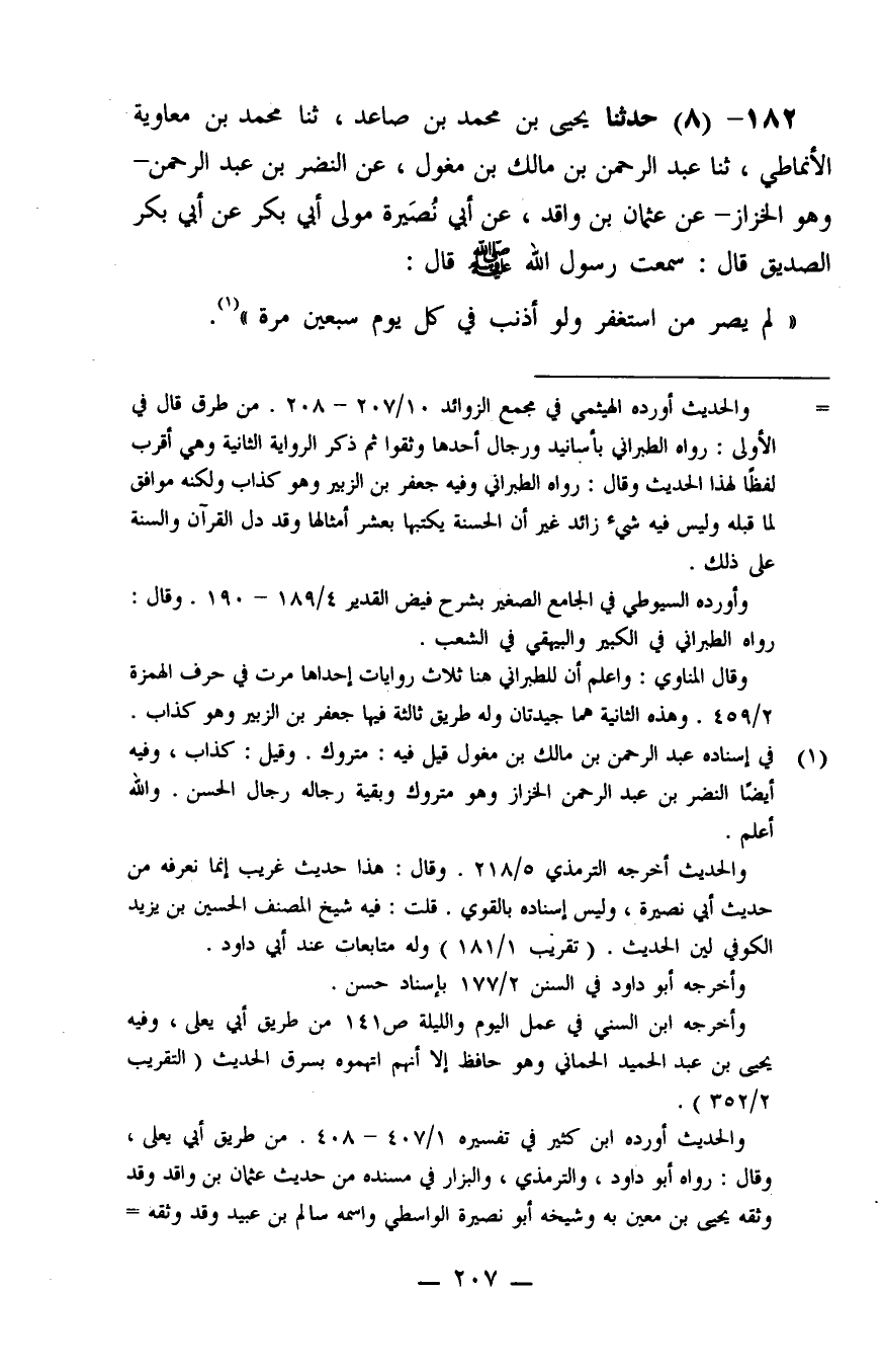 182 - حَدَّثَنَا يَحْيَى بْنُ مُحَمَّدِ بْنِ صَاعِدٍ، ثنا مُحَمَّدُ بْنُ مُعَاوِيَةَ الْأَنْمَاطِيُّ، ثنا عَبْدُ الرَّحْمَنِ بْنُ مَالِكِ بْنِ مِغْوَلٍ، عَنِ النَّضْرِ بْنِ عَبْدِ الرَّحْمَنِ وَهُوَ الْخَزَّاز، عَنْ عُثْمَانَ بْنِ وَاقِدٍ، عَنْ أَبِي نُصَيْرَةَ، مَوْلَى أَبِي بَكْرٍ، عَنْ أَبِي بَكْرٍ الصِّدِّيقِ، قَالَ: سَمِعْتُ رَسُولَ اللَّهِ صَلَّى اللَّهُ عَلَيْهِ وَسَلَّمَ قَالَ: «لَمْ يُصِرَّ مَنِ اسْتَغْفَرَ، وَلَوْ أَذْنَبَ فِي كُلِّ يَوْمٍ سَبْعِينَ مَرَّةً»