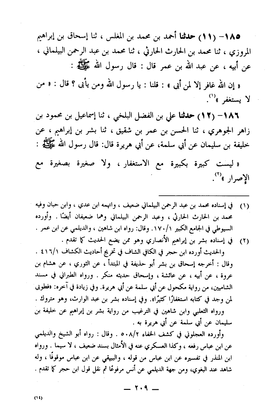 185 - حَدَّثَنَا أَحْمَدُ بْنُ مُحَمَّدِ بْنِ الْمُغَلِّسِ، ثنا إِسْحَاقُ بْنُ إِبْرَاهِيمَ الْمَرْوَزِيُّ، ثنا مُحَمَّدُ بْنُ الْحَارِثِ الْحَارِثِيُّ، ثنا مُحَمَّدُ بْنُ عَبْدِ الرَّحْمَنِ الْبَيْلَمَانِيُّ، عَنْ أَبِيهِ، عَنْ عَبْدِ اللَّهِ بْنِ عُمَرَ، قَالَ: قَالَ رَسُولُ اللَّهِ صَلَّى اللَّهُ عَلَيْهِ وَسَلَّمَ: «إِنَّ اللَّهَ غَافِرٌ إِلَّا لِمَنْ أَبَى». قُلْنَا: يَا رَسُولَ اللَّهِ، وَمَنْ يَأبَى؟ قَالَ: «مَنْ لَا يَسْتَغْفِرُ»
