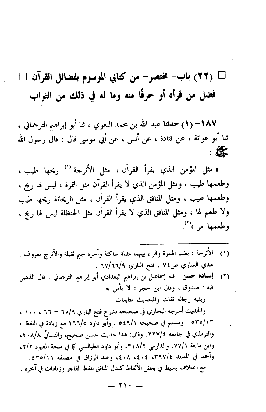 187 - حَدَّثَنَا عَبْدُ اللَّهِ بْنُ مُحَمَّدٍ الْبَغَوِيُّ، ثنا أَبُو إِبْرَاهِيمَ التَّرْجُمَانِيُّ، ثنا أَبُو عَوَانَةَ، عَنْ قَتَادَةَ، عَنْ أَنَسٍ، عَنْ أَبِي مُوسَى، قَالَ: قَالَ رَسُولُ اللَّهِ صَلَّى اللَّهُ عَلَيْهِ وَسَلَّمَ: «مَثَلُ الْمُؤْمِنِ الَّذِي يَقْرَأُ الْقُرْآنَ مَثَلُ الْأُتْرُجَّةِ، رِيحُهَا طَيِّبٌ، وَطَعْمُهَا طَيِّبٌ. وَمَثَلُ الْمُؤْمِنِ الَّذِي لَا يَقْرَأُ الْقُرْآنَ مَثَلُ التَّمْرَةِ، لَيْسَ لَهَا رِيحٌ، وَطَعْمُهَا طَيِّبٌ. وَمَثَلُ الْمُنَافِقِ الَّذِي يَقْرَأُ الْقُرْآنَ مَثَلُ الرَّيْحَانَةِ، رِيحُهَا طَيِّبٌ وَلَا طَعْمَ لَهَا. وَمَثَلُ الْمُنَافِقِ الَّذِي لَا يَقْرَأُ الْقُرْآنَ مَثَلُ الْحَنْظَلَةِ، لَيْسَ لَهَا رِيحٌ، وَطَعْمُهَا مُرٌّ»