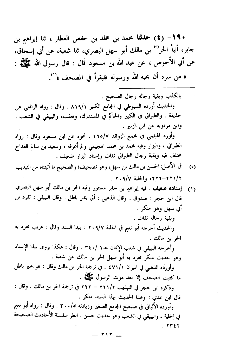 190 - حَدَّثَنَا مُحَمَّدُ بْنُ مَخْلَدِ بْنِ حَفْصٍ الْعَطَّارُ، ثنا إِبْرَاهِيمُ بْنُ جَابِرٍ، أَنْبَأَ الْحُرُّ بْنُ مَالِكٍ أَبُو سَهْلٍ الْبَصْرِيُّ، ثنا شُعْبَةُ، عَنْ أَبِي إِسْحَاقَ، عَنْ أَبِي الْأَحْوَصِ، عَنْ عَبْدِ اللَّهِ بْنِ مَسْعُودٍ، قَالَ: قَالَ رَسُولُ اللَّهِ صَلَّى اللَّهُ عَلَيْهِ وَسَلَّمَ: «مَنْ سَرَّهُ أَنْ يُحِبَّهُ اللَّهُ وَرَسُولُهُ فَلْيَقْرَأ فِي الْمُصْحَفِ»