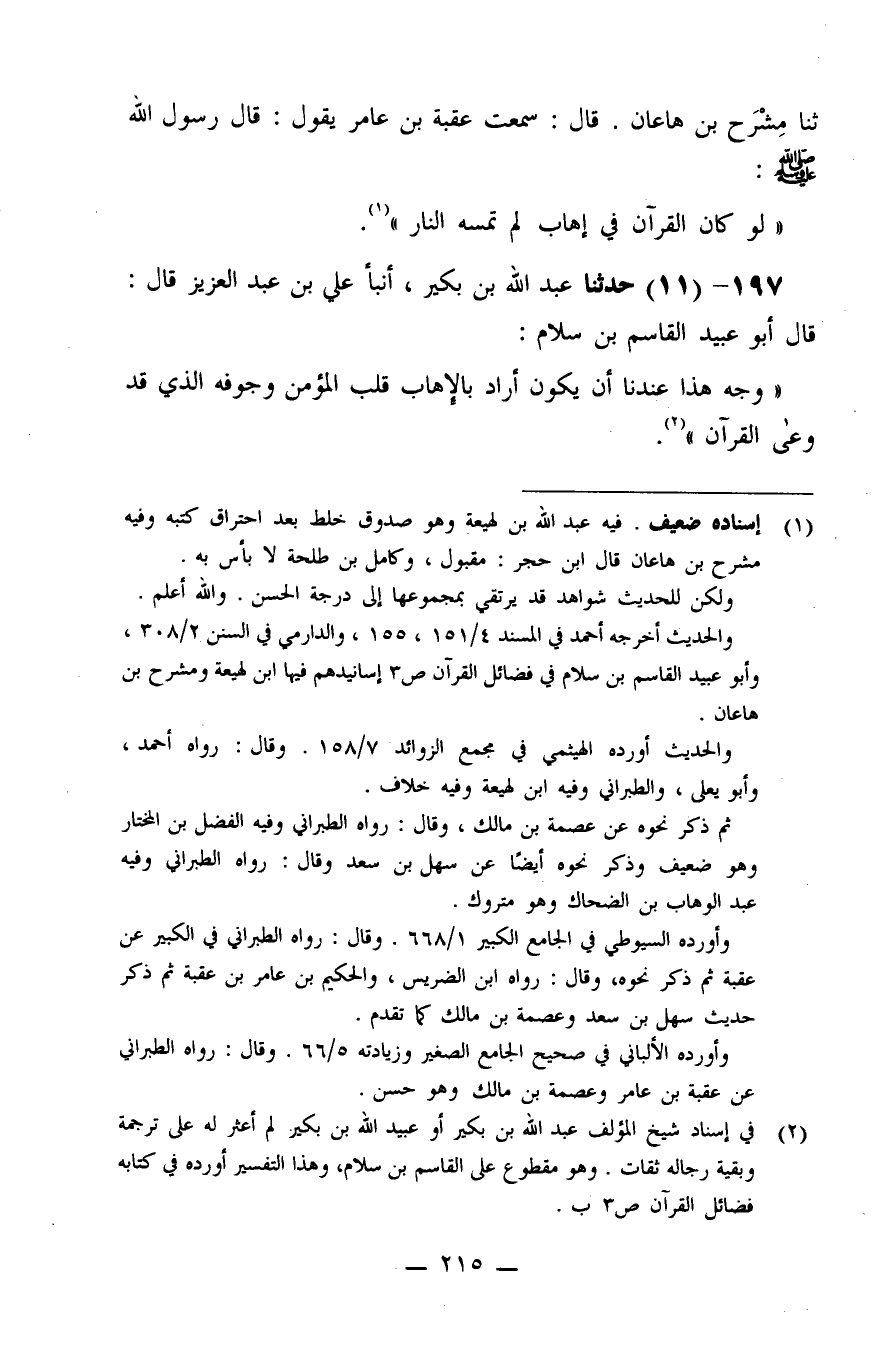 197 - حَدَّثَنَا عَبْدُ اللَّهِ بْنُ بُكَيْرٍ، أَنْبَأَ عَلِيُّ بْنُ عَبْدِ الْعَزِيزِ قَالَ: قَالَ أَبُو عُبَيْدٍ الْقَاسِمُ بْنُ سَلَّامٍ: «وَجْهُ هَذَا عِنْدَنَا أَنْ يَكُونَ أَرَادَ بِالْإِهَابِ قَلْبَ الْمُؤْمِنِ وَجَوْفَهُ الَّذِي قَدْ وَعَى الْقُرْآنَ»