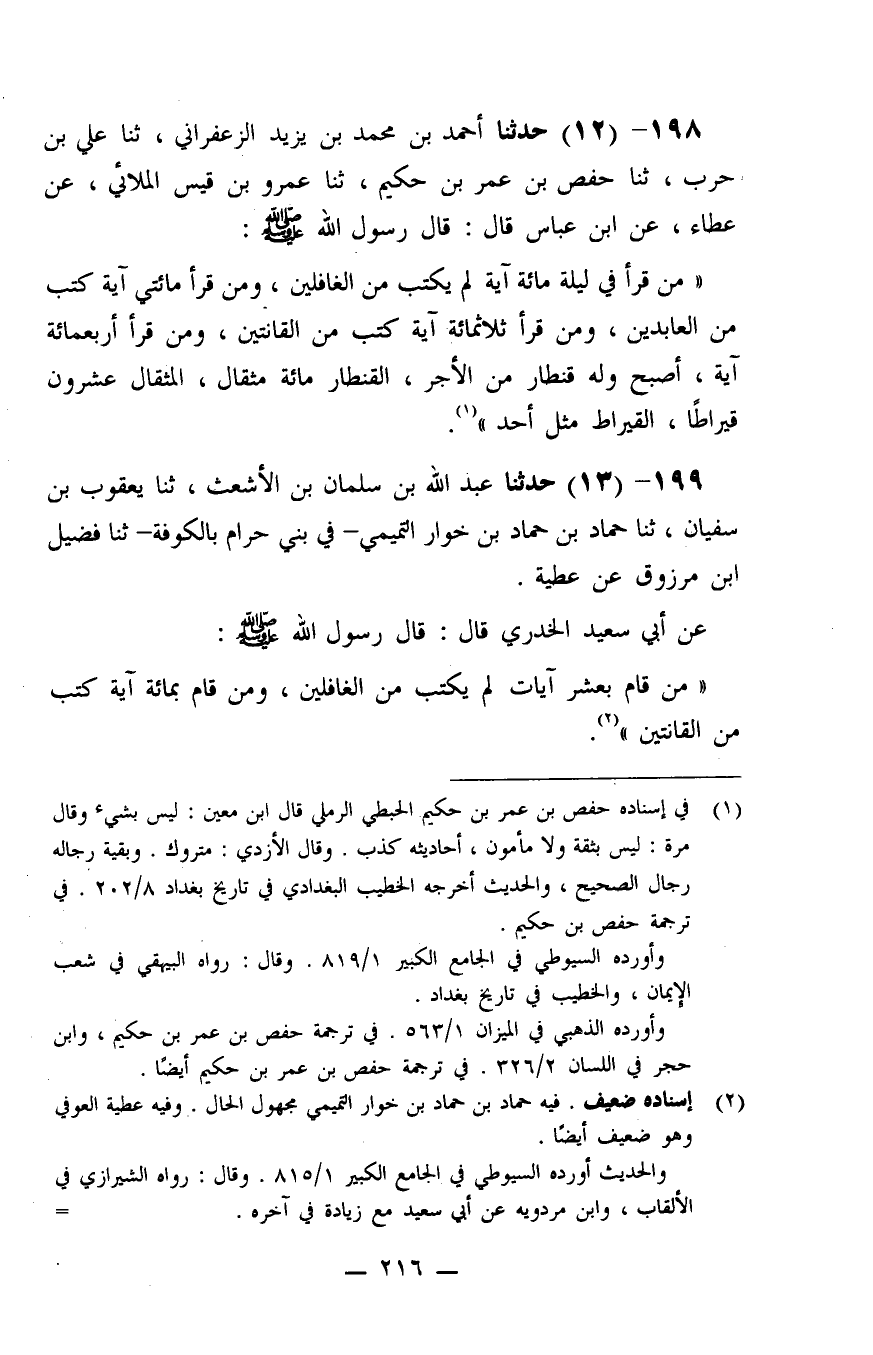 198 - حَدَّثَنَا أَحْمَدُ بْنُ مُحَمَّدِ بْنِ يَزِيدَ الزَّعْفَرَانِيُّ، ثنا عَلِيُّ بْنُ حَرْبٍ، ثنا حَفْصُ بْنُ عُمَرَ بْنِ حَكِيمٍ، ثنا عَمْرُو بْنُ قَيْسٍ الْمُلَائِيُّ، عَنْ عَطَاءٍ، عَنِ ابْنِ عَبَّاسٍ، قَالَ: قَالَ رَسُولُ اللَّهِ صَلَّى اللَّهُ عَلَيْهِ وَسَلَّمَ: «مَنْ قَرَأَ فِي لَيْلَةٍ مِائَةَ آيَةٍ لَمْ يُكْتَبْ مِنَ الْغَافِلِينَ، وَمَنْ قَرَأَ مِائَتَيْ آيَةٍ كُتِبَ مِنَ الْعَابِدِينَ، وَمَنْ قَرَأَ ثَلَاثَمِائَةِ آيَةٍ كُتِبَ مِنَ الْقَانِتِينَ، وَمَنْ قَرَأَ أَرْبَعَمِائَةِ آيَةٍ أَصْبَحَ وَلَهُ قِنْطَارٌ مِنَ الْأَجْرِ، الْقِنْطَارُ مِائَةُ مِثْقَالٍ، الْمِثْقَالُ عِشْرُونَ قِيرَاطًا، الْقِيرَاطُ مِثْلُ أُحُدٍ»