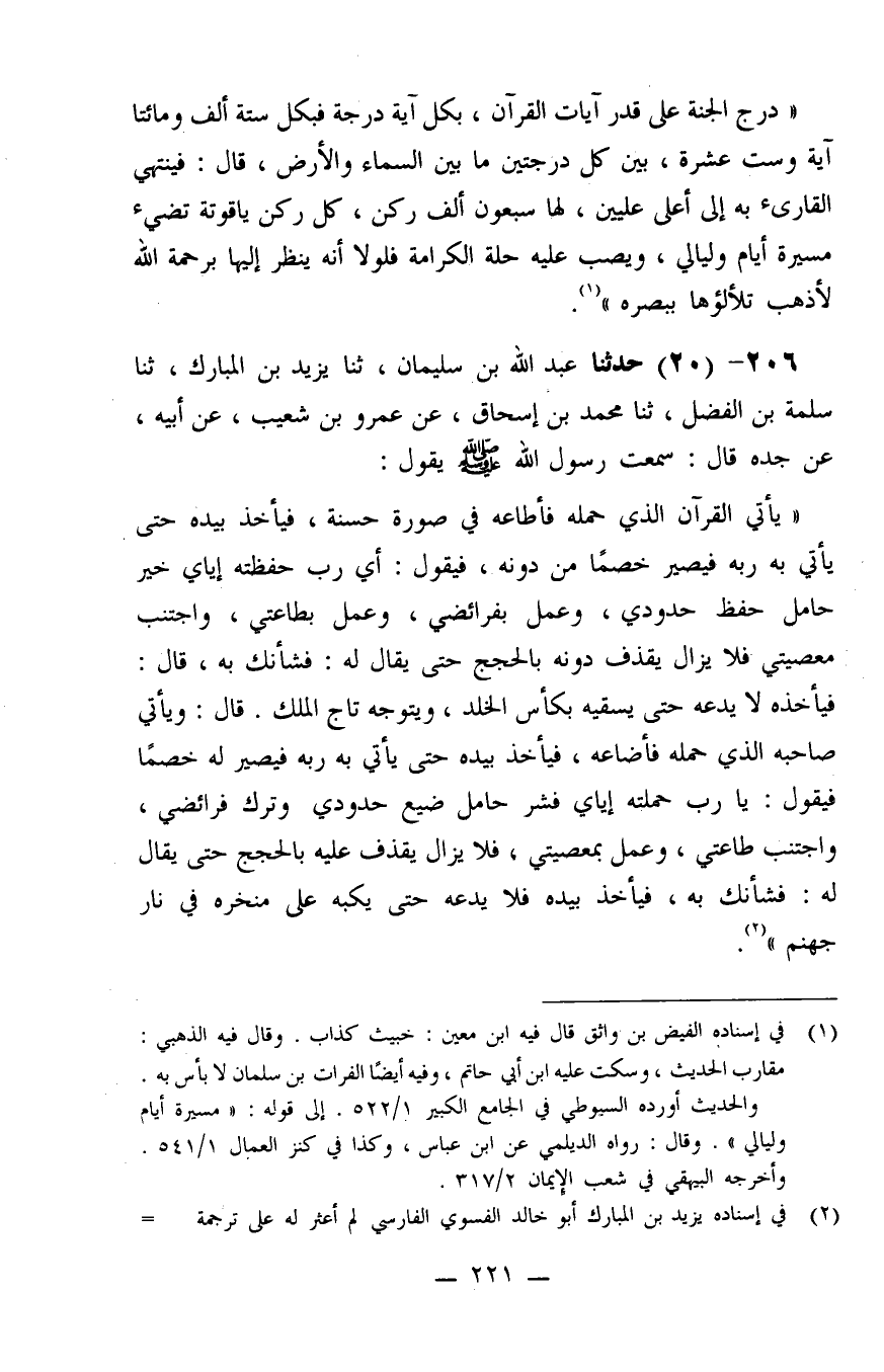 206 - حَدَّثَنَا عَبْدُ اللَّهِ بْنُ سُلَيْمَانَ، ثنا يَزِيدُ بْنُ الْمُبَارَكِ، ثنا سَلَمَةُ بْنُ الْفَضْلِ، ثنا مُحَمَّدُ بْنُ إِسْحَاقَ، عَنْ عَمْرِو بْنِ شُعَيْبٍ، عَنْ أَبِيهِ، عَنْ جَدِّهِ، قَالَ: سَمِعْتُ رَسُولَ اللَّهِ صَلَّى اللَّهُ عَلَيْهِ وَسَلَّمَ يَقُولُ: " يَأتِي الْقُرْآنُ الَّذِي حَمَلَهُ فَأَطَاعَهُ فِي صُورَةٍ حَسَنَةٍ، فَيَأخُذُ بِيَدِهِ حَتَّى يَاتِيَ بِهِ رَبَّهُ فَيَصِيرَ خَصْمًا مِنْ دُونِهِ، فَيَقُولُ: أَيْ رَبِّ حَفَّظْتَهُ إِيَّايَ، خَيْرُ حَامِلٍ، حَفِظَ حُدُودِي، وَعَمِلَ بِفَرَائِضِي، وَعَمِلَ بِطَاعَتِي، وَاجْتَنَبَ مَعْصِيَتِي فَلَا. يَزَالُ يَقْذِفُ دُونَهُ بِالْحُجَجِ حَتَّى يُقَالَ لَهُ: فَشَأنَكَ بِهِ. قَالَ: فَيَأخُذُهُ لَا يَدَعُهُ حَتَّى يَسْقِيَهُ بِكَأسِ الْخُلْدِ وَيُتَوِّجُهُ تَاجَ الْمُلْكِ. قَالَ: وَيَاتِي صَاحِبَهُ الَّذِي حَمَلَهُ فَأَضَاعَهُ، فَيَاخُذُ بِيَدِهِ حَتَّى يَأتِيَ بِهِ رَبَّهُ، فَيَصِيرَ لَهُ خَصْمًا فَيَقُولُ: يَا رَبِّ حَمَّلْتَهُ إِيَّايَ، فَشَرُّ حَامِلٍ، ضَيَّعَ حُدُودِي، وَتَرَكَ فَرَائِضِي، وَاجْتَنَبَ طَاعَتِي، وَعَمِلَ بِمَعْصِيَتِي، فَلَا يَزَالُ يَقْذِفُ عَلَيْهِ بِالْحُجَجِ حَتَّى يُقَالَ لَهُ: فَشَأنَكَ بِهِ. فَيَأخُذُ بِيَدِهِ فَلَا يَدَعُهُ حَتَّى يَكُبَّهُ عَلَى مَنْخَرِهِ فِي نَارِ جَهَنَّمَ "