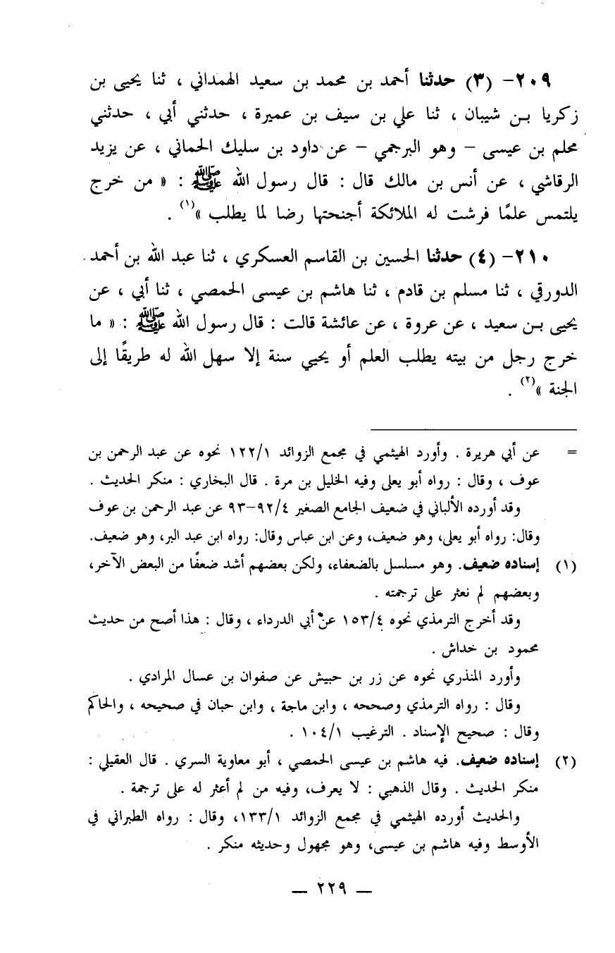 209 - حَدَّثَنَا أَحْمَدُ بْنُ مُحَمَّدِ بْنِ سَعِيدٍ الْهَمْدَانِيُّ، ثنا يَحْيَى بْنُ زَكَرِيَّا بْنِ شَيْبَانَ، ثنا عَلِيُّ بْنُ سَيْفِ بْنِ عَمِيرَةَ، حَدَّثَنِي أَبِي، حَدَّثَنِي مُحَلَّمُ بْنُ عِيسَى وَهُوَ الْبُرْجُمِيُّ، عَنْ دَاوُدَ بْنِ سُلَيْكٍ الْحِمَّانِيِّ، عَنْ يَزِيدَ الرَّقَاشِيِّ، عَنْ أَنَسِ بْنِ مَالِكٍ، قَالَ: قَالَ رَسُولُ اللَّهِ صَلَّى اللَّهُ عَلَيْهِ وَسَلَّمَ: «مَنْ خَرَجَ يَلْتَمِسُ عِلْمًا فَرَشَتْ لَهُ الْمَلَائِكَةُ أَجْنِحَتَهَا رِضًا لِمَا يَطْلُبُ»