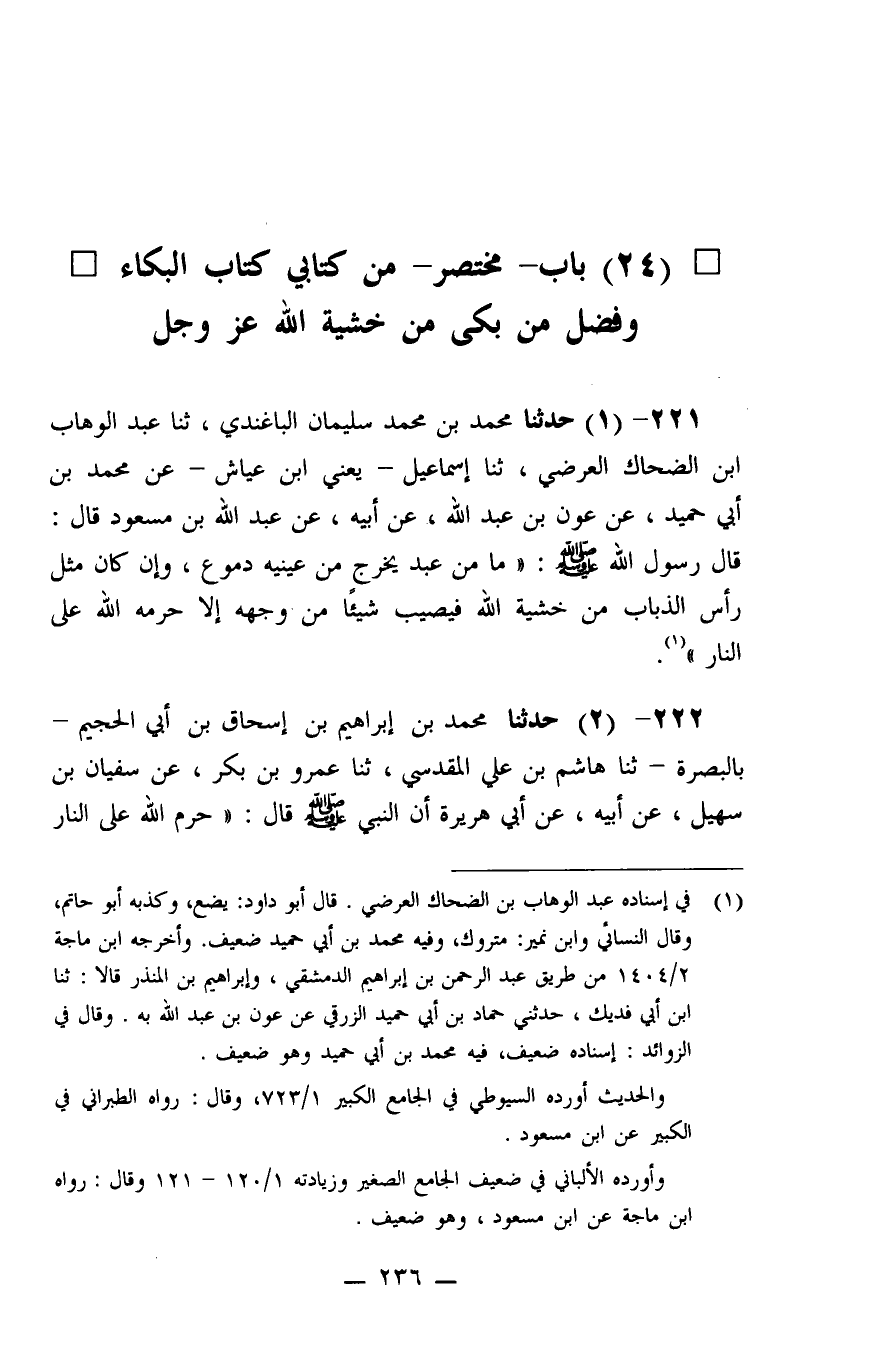 221 - حَدَّثَنَا مُحَمَّدُ بْنُ مُحَمَّدِ بْنِ سُلَيْمَانَ الْبَاغَنْدِيُّ، ثنا عَبْدُ الْوَهَّابِ بْنُ الضَّحَّاكِ الْعُرْضِيُّ، ثنا إِسْمَاعِيلُ يَعْنِي ابْنَ عَيَّاشٍ، عَنْ مُحَمَّدِ بْنِ أَبِي حُمَيْدٍ، عَنْ عَوْنِ بْنِ عَبْدِ اللَّهِ، عَنْ أَبِيهِ، عَنْ عَبْدِ اللَّهِ بْنِ مَسْعُودٍ، قَالَ: قَالَ رَسُولُ اللَّهِ صَلَّى اللَّهُ عَلَيْهِ وَسَلَّمَ: «مَا مِنْ عَبْدٍ يَخْرُجُ مِنْ عَيْنَيْهِ دُمُوعٌ، وَإِنْ كَانَ مِثْلَ رَأسِ الذُّبَابِ مِنْ خَشْيَةِ اللَّهِ فَيُصِيبُ شَيْئًا مِنْ وَجْهِهِ إِلَّا حَرَّمَهُ اللَّهُ عَلَى النَّارِ»
