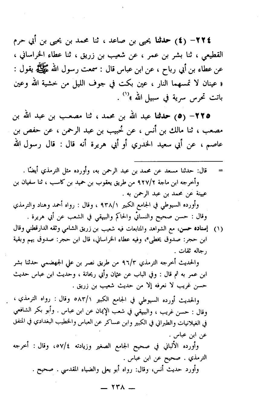 224 - حَدَّثَنَا يَحْيَى بْنُ صَاعِدٍ، ثنا مُحَمَّدُ بْنُ يَحْيَى بْنِ أَبِي حَزْمٍ الْقُطَعِيُّ (1)، ثنا بِشْرُ بْنُ عُمَرَ، عَنْ شُعَيْبِ بْنِ زُرَيْقٍ، ثنا عَطَاءٌ الْخُرَاسَانِيُّ، عَنْ عَطَاءِ بْنِ أَبِي رَبَاحٍ، عَنِ ابْنِ عَبَّاسٍ، قَالَ: سَمِعْتُ رَسُولَ اللَّهِ صَلَّى اللَّهُ عَلَيْهِ وَسَلَّمَ يَقُولُ: " عَيْنَانِ لَا تَمَسُّهُمَا النَّارُ: عَيْنٌ بَكَتْ فِي جَوْفِ اللَّيْلِ مِنْ خَشْيَةِ اللَّهِ، وَعَيْنٌ بَاتَتْ تَحْرُسُ سَرِيَّةً فِي سَبِيلِ اللَّهِ "