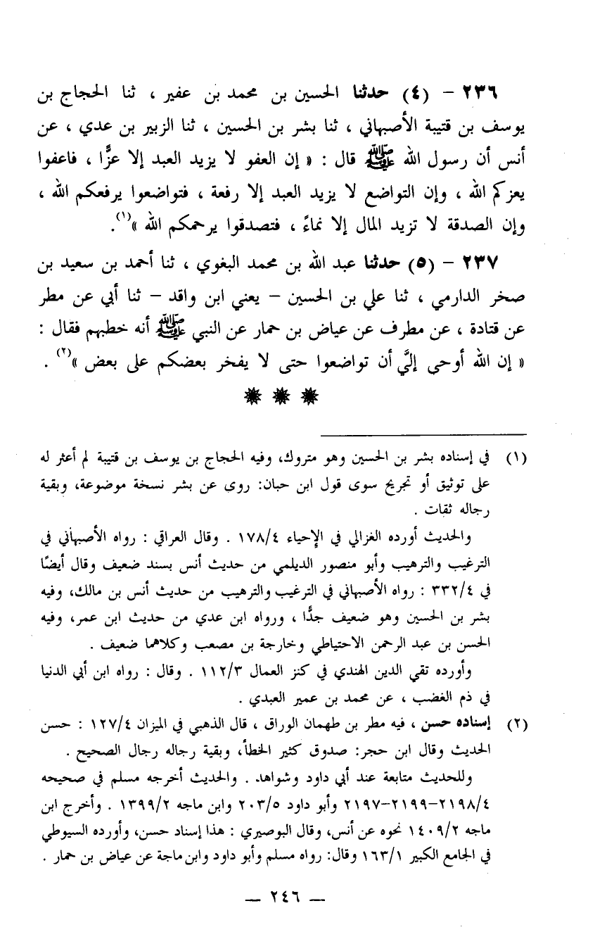 236 - حَدَّثَنَا الْحُسَيْنُ بْنُ مُحَمَّدِ بْنِ عُفَيْرٍ، ثنا الْحَجَّاجُ بْنُ يُوسُفَ بْنِ قُتَيْبَةَ الْأَصْبَهَانِيُّ، ثنا بِشْرُ بْنُ الْحُسَيْنِ، ثنا الزُّبَيْرُ بْنُ عَدِيٍّ، عَنْ أَنَسٍ، أَنَّ رَسُولَ اللَّهِ صَلَّى اللَّهُ عَلَيْهِ وَسَلَّمَ قَالَ: «إِنَّ الْعَفْوَ لَا يَزِيدُ الْعَبْدَ إِلَّا عِزًّا، فَاعْفُوا يُعِزَّكُمُ اللَّهُ، وَإِنَّ التَّوَاضُعَ لَا يَزِيدُ الْعَبْدَ إِلَّا رِفْعَةً، فَتَوَاضَعُوا يَرْفَعْكُمُ اللَّهُ، وَإِنَّ الصَّدَقَةَ لَا تَزِيدُ الْمَالَ إِلَّا نَمَاءً، فَتَصَدَّقُوا يَرْحَمْكُمُ اللَّهُ»