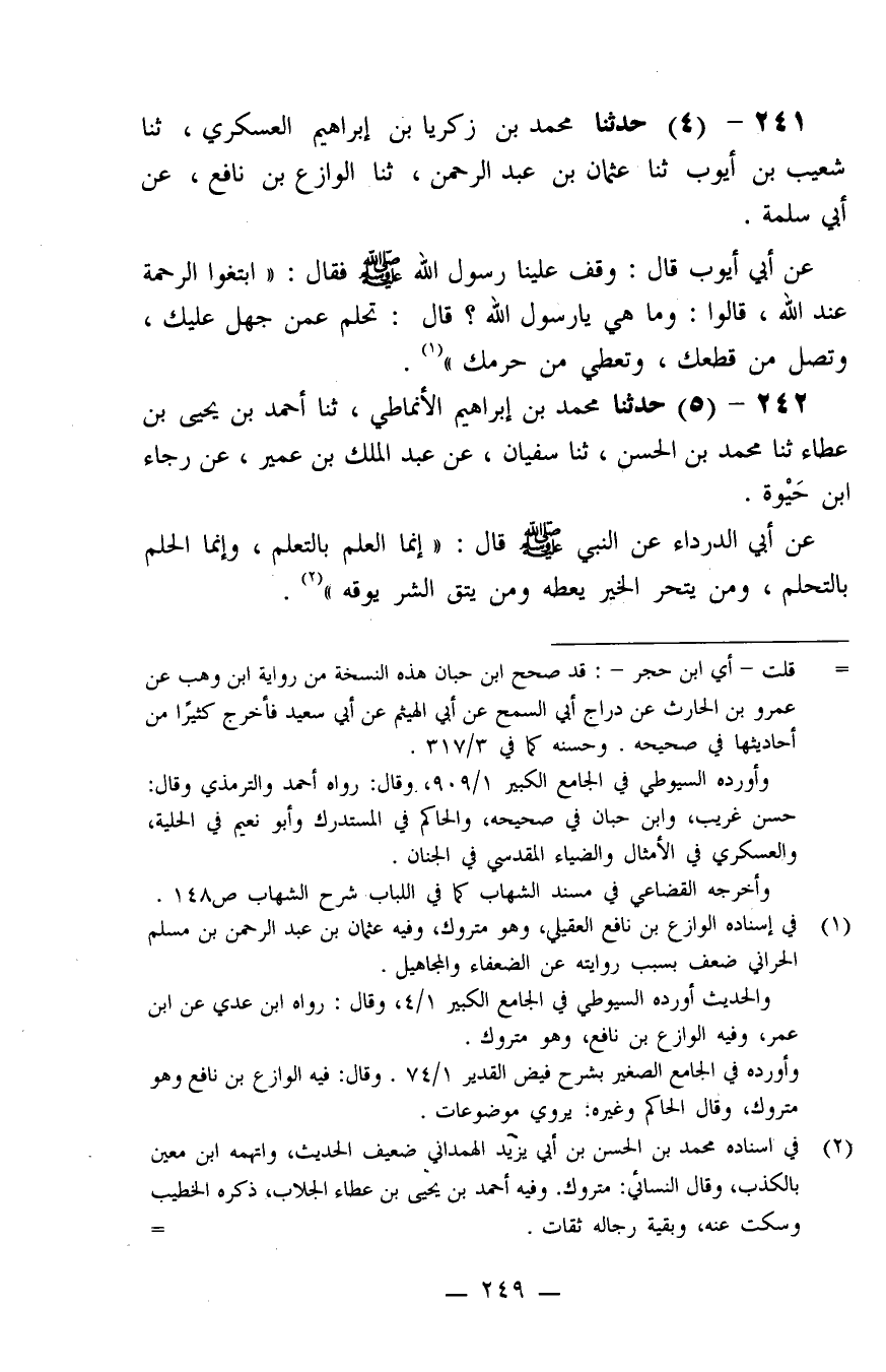 241 - حَدَّثَنَا مُحَمَّدُ بْنُ زَكَرِيَّا بْنِ إِبْرَاهِيمَ الْعَسْكَرِيُّ، ثنا شُعَيْبُ بْنُ أَيُّوبَ، ثنا عُثْمَانُ بْنُ عَبْدِ الرَّحْمَنِ، ثنا الْوَازِعُ بْنُ نَافِعٍ، عَنْ أَبِي سَلَمَةَ، عَنْ أَبِي أَيُّوبَ، قَالَ: وَقَفَ عَلَيْنَا رَسُولُ اللَّهِ صَلَّى اللَّهُ عَلَيْهِ وَسَلَّمَ، فَقَالَ: " ابْتَغُوا الرَّحْمَةَ عِنْدَ اللَّهِ. قَالُوا: وَمَا هِيَ يَا رَسُولَ اللَّهِ؟ قَالَ: تَحْلُمُ عَمَّنْ جَهِلَ عَلَيْكَ، وَتَصِلُ مَنْ قَطَعَكَ، وَتُعْطِي مَنْ حَرَمَكَ "