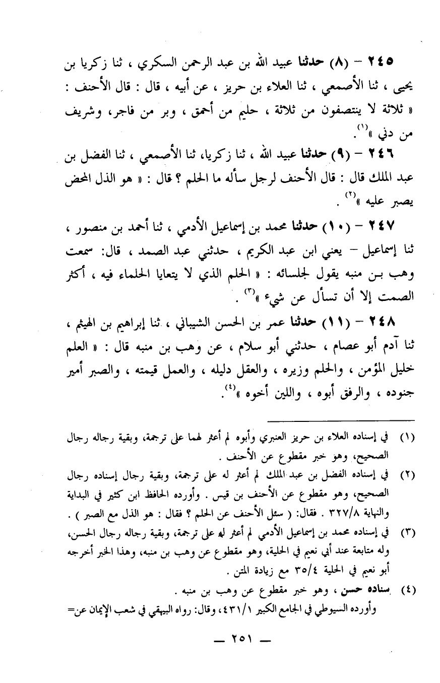 246 - حَدَّثَنَا عُبَيْدُ اللَّهِ، ثنا زَكَرِيَّا، ثنا الْأَصْمَعِيُّ، ثنا الْفَضْلُ بْنُ عَبْدِ الْمَلِكِ، قَالَ: قَالَ الْأَحْنَفُ لِرَجُلٍ سَأَلَهُ مَا الْحِلْمُ؟ قَالَ: «هُوَ الذُّلُّ الْمَحْضُ يُصْبَرُ عَلَيْهِ»