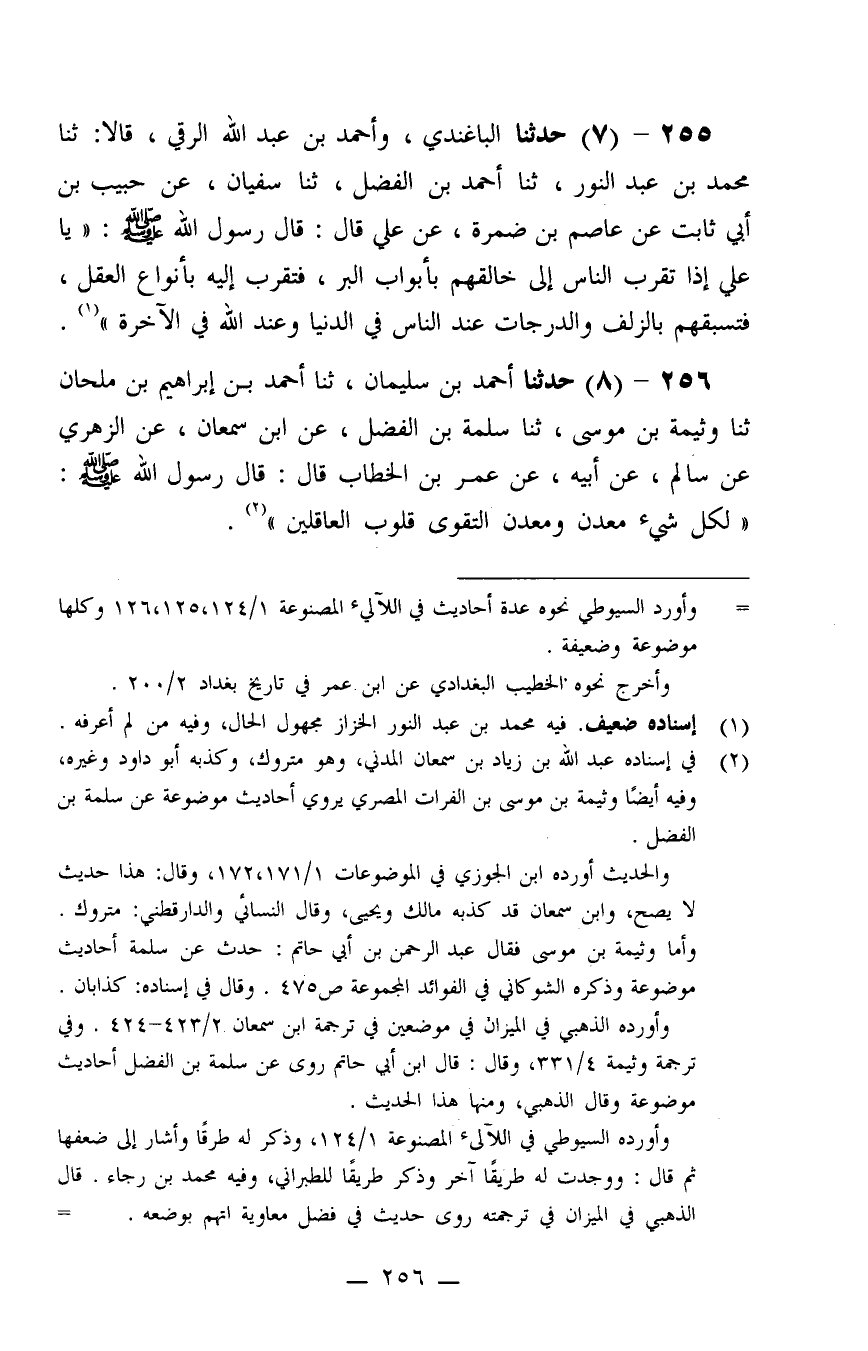 256 - حَدَّثَنَا أَحْمَدُ بْنُ سُلَيْمَانَ، ثنا أَحْمَدُ بْنُ إِبْرَاهِيمَ بْنِ مِلْحَانَ، ثنا وَثِيمَةُ بْنُ مُوسَى، ثنا سَلَمَةُ بْنُ الْفَضْلِ، عَنِ ابْنِ سَمْعَانَ، عَنِ الزُّهْرِيِّ، عَنْ سَالِمٍ، عَنْ أَبِيهِ، عَنْ عُمَرَ بْنِ الْخَطَّابِ، قَالَ: قَالَ رَسُولُ اللَّهِ صَلَّى اللَّهُ عَلَيْهِ وَسَلَّمَ: «لِكُلِّ شَيْءٍ مَعْدِنٌ، وَمَعْدِنُ التَّقْوَى قُلُوبُ الْعَاقِلِينَ»