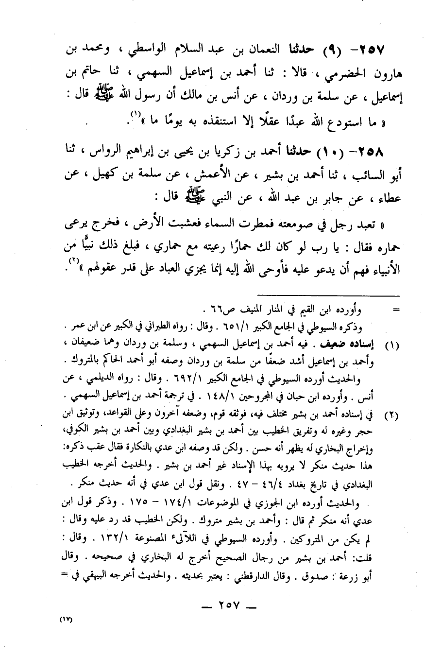 258 - حَدَّثَنَا أَحْمَدُ بْنُ زَكَرِيَّا بْنِ يَحْيَى بْنِ إِبْرَاهِيمَ الرَّوَّاسُ، ثنا أَبُو السَّائِبِ، ثنا أَحْمَدُ بْنُ بَشِيرٍ، عَنِ الْأَعْمَشِ، عَنْ سَلَمَةَ بْنِ كُهَيْلٍ، عَنْ عَطَاءٍ، عَنْ جَابِرِ بْنِ عَبْدِ اللَّهِ، عَنِ النَّبِيِّ صَلَّى اللَّهُ عَلَيْهِ وَسَلَّمَ قَالَ: " تَعَبَّدَ رَجُلٌ فِي صَوْمَعَتِهِ فَمَطَرَتِ السَّمَاءُ فَعَشِبَتِ الْأَرْضُ، فَخَرَجَ يَرْعَى حِمَارَهُ، فَقَالَ: يَا رَبِّ لَوْ كَانَ لَكَ حِمَارٌ رَعَيْتُهُ مَعَ حِمَارِي، فَبَلَغَ ذَلِكَ نَبِيًّا مِنَ الْأَنْبِيَاءِ، فَهَمَّ أَنْ يَدْعُوَ عَلَيْهِ، فَأَوْحَى اللَّهُ إِلَيْهِ: إِنَّمَا يُجْزَى الْعِبَادُ عَلَى قَدْرِ عُقُولِهِمْ "
