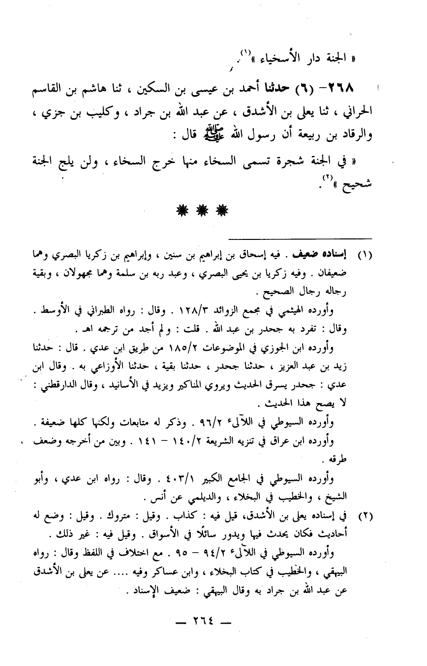 268 - حَدَّثَنَا أَحْمَدُ بْنُ عِيسَى بْنِ السُّكَيْنِ، ثنا هَاشِمُ بْنُ الْقَاسِمِ الْحَرَّانِيُّ، ثنا يَعْلَى بْنُ الْأَشْدَقِ، عَنْ عَبْدِ اللَّهِ بْنِ جَرَادٍ، وَكُلَيْبِ بْنِ جُزَيٍّ، وَالرَّقَّادِ بْنِ رَبِيعَةَ، أَنَّ رَسُولَ اللَّهِ صَلَّى اللَّهُ عَلَيْهِ وَسَلَّمَ قَالَ: «فِي الْجَنَّةِ شَجَرَةٌ تُسَمَّى السَّخَاءَ، مِنْهَا خَرَجَ السَّخَاءُ، وَلَنْ يَلِجَ الْجَنَّةَ شَحِيحٌ»