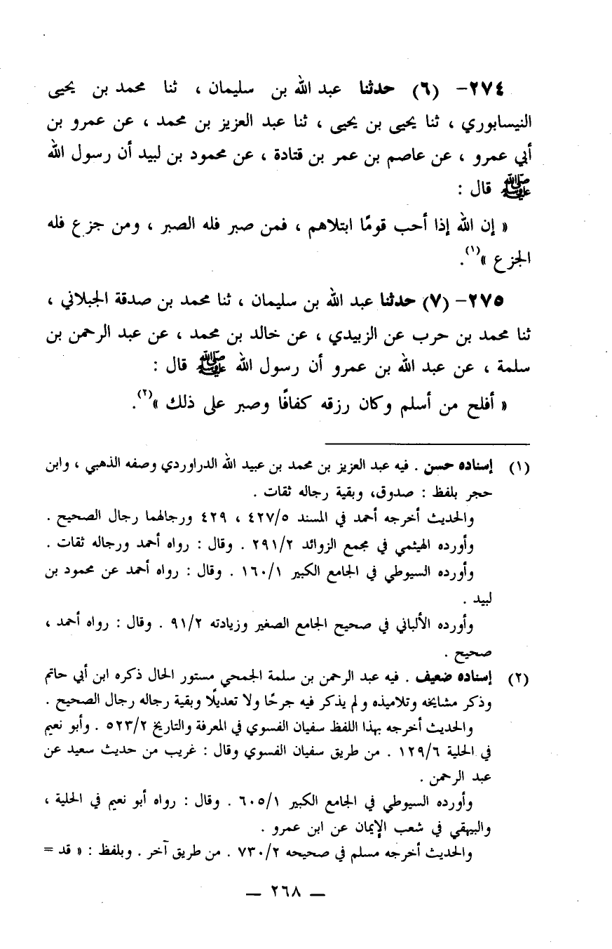 275 - حَدَّثَنَا عَبْدُ اللَّهِ بْنُ سُلَيْمَانَ، ثنا مُحَمَّدُ بْنُ صَدَقَةَ الْجُبْلَانِيُّ، ثنا مُحَمَّدُ بْنُ حَرْبٍ، عَنِ الزُّبَيْدِيِّ، عَنْ خَالِدِ بْنِ مُحَمَّدٍ، عَنْ عَبْدِ الرَّحْمَنِ بْنِ سَلَمَةَ، عَنْ عَبْدِ اللَّهِ بْنِ عَمْرٍو، أَنَّ رَسُولَ اللَّهِ صَلَّى اللَّهُ عَلَيْهِ وَسَلَّمَ قَالَ: «أَفْلَحَ مَنْ أَسْلَمَ وَكَانَ رِزْقُهُ كَفَافًا وَصَبَرَ عَلَى ذَلِكَ»