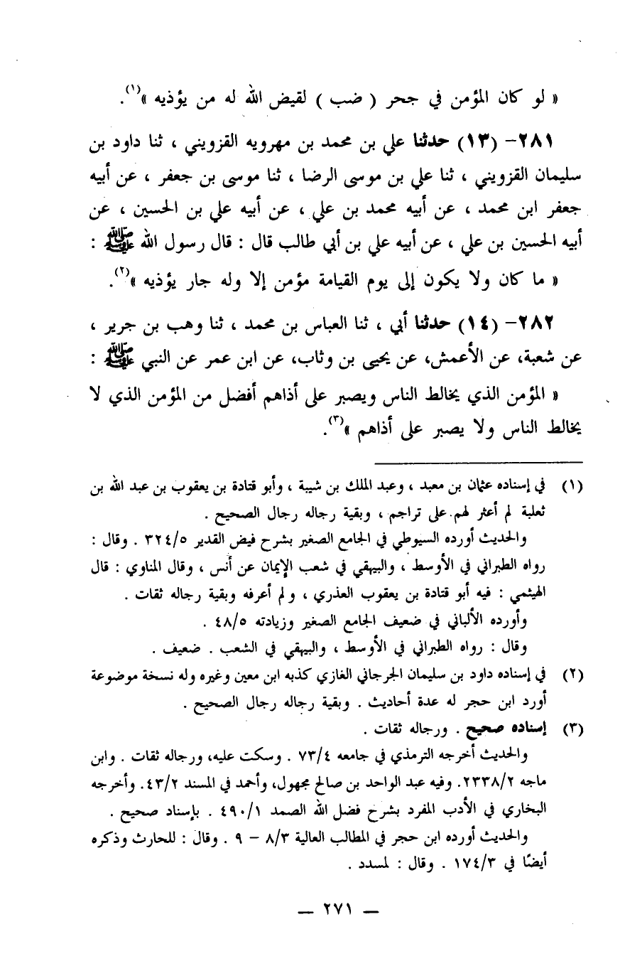 281 - حَدَّثَنَا عَلِيُّ بْنُ مُحَمَّدِ بْنِ مَهْرَوَيْهِ الْقَزْوِينِيُّ، ثنا دَاوُدُ بْنُ سُلَيْمَانَ الْقَزْوِينِيُّ، ثنا عَلِيُّ بْنُ مُوسَى الرِّضَا، ثنا مُوسَى بْنُ جَعْفَرٍ، عَنْ أَبِيهِ جَعْفَرِ بْنِ مُحَمَّدٍ، عَنْ أَبِيهِ مُحَمَّدِ بْنِ عَلِيٍّ، عَنْ أَبِيهِ عَلِيِّ بْنِ الْحُسَيْنِ، عَنْ أَبِيهِ الْحُسَيْنِ بْنِ عَلِيٍّ، عَنْ أَبِيهِ عَلِيِّ بْنِ أَبِي طَالِبٍ، قَالَ: قَالَ رَسُولُ اللَّهِ صَلَّى اللَّهُ عَلَيْهِ وَسَلَّمَ: «مَا كَانَ وَلَا يَكُونُ إِلَى يَوْمِ الْقِيَامَةِ مُؤْمِنٌ إِلَّا وَلَهُ جَارٌ يُؤْذِيهِ»
