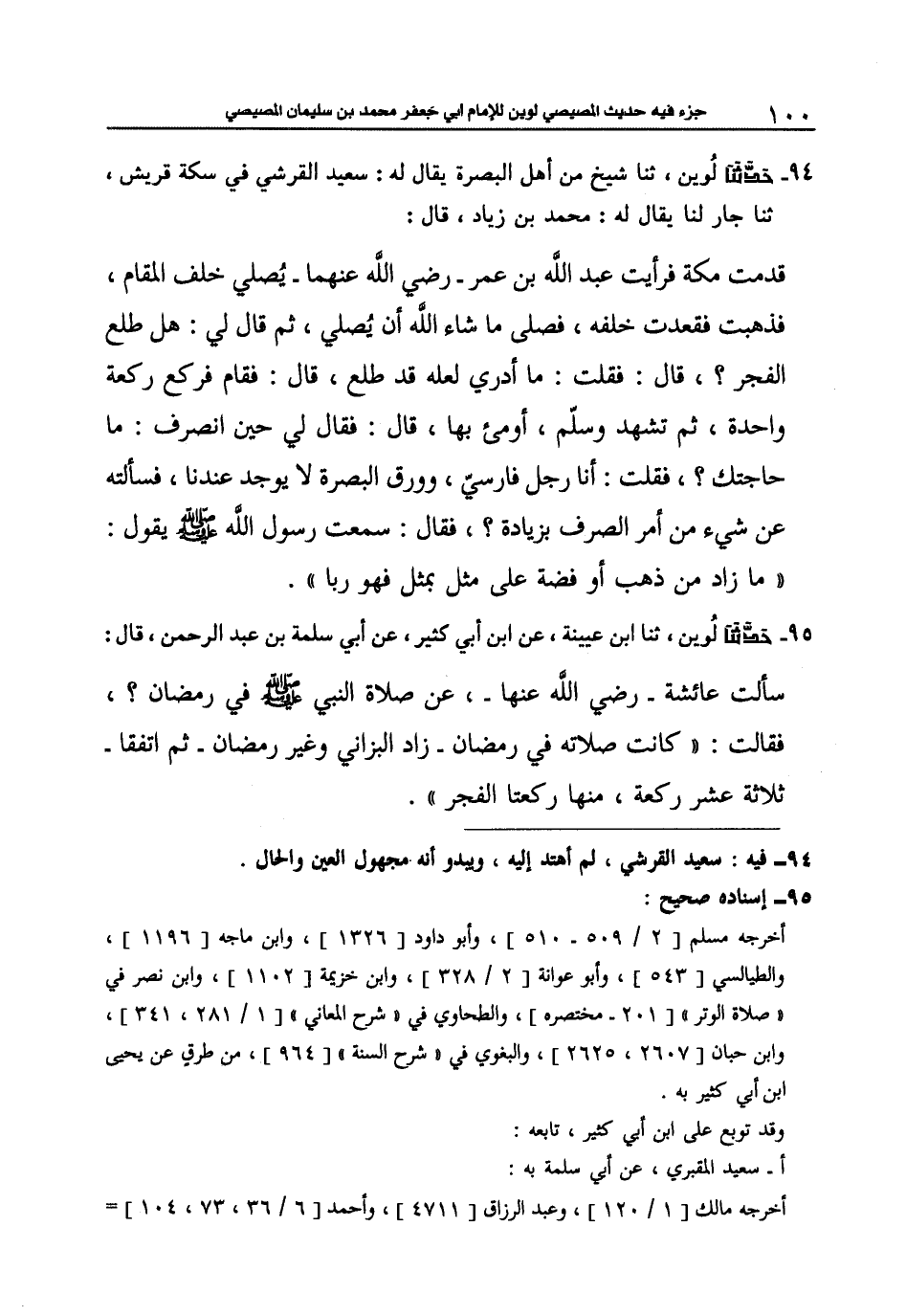 94 - حَدَّثَنَا شَيْخٌ مِنْ أَهْلِ الْبَصْرَةَ يُقَالُ لَهُ: سَعِيدٌ الْقُرَشِيُّ فِي سِكَّةِ قُرَيْشٍ، نا جَارٌ لَنَا يُقَالُ لَهُ: مُحَمَّدُ بْنُ زِيَادٍ قَالَ: قَدِمْتُ مَكَّةَ، فَرَأَيْتُ عَبْدَ اللَّهِ بْنَ عُمَرَ رَضِيَ اللَّهُ عَنْهُمَا , يُصَلِّي خَلْفَ الْمَقَامِ، فَذَهَبْتُ فَقَعَدْتُ خَلْفَهُ، فَصَلَّى مَا شَاءَ اللَّهُ أَنْ يُصَلِّيَ، ثُمَّ قَالَ لِي: هَلْ طَلَعَ الْفَجْرُ، قَالَ: فَقُلْتُ: لَا، مَا أَدْرِي لَعَلَّهُ قَدْ طَلَعَ. قَالَ: فَقَامَ فَرَكَعَ رَكْعَةً وَاحِدَةً، ثُمَّ تَشَهَّدَ فَسَلَّمَ، أَوتَرَ بِهَا، فَقَالَ لِي حِينَ انْصَرَفَ: مَا حَاجَتُكَ؟ . فَقُلْتُ: لَنَا رَجُلٌ فَارِسِيٌّ وَوَرِقُ الْبَصْرَةِ لَا يُوجَدُ عِنْدَنَا، فَسَأَلْتُهُ عَنْ شَيْءٍ مِنْ أَمْرِ الصَّرْفِ بِزِيَادَةٍ. فَقَالَ: سَمِعْتُ رَسُولَ اللَّهِ صَلَّى اللهُ عَلَيْهِ وَسَلَّمَ يَقُولُ: «§مَا زَادَ مِنْ ذَهَبٍ أَوْ فِضَّةٍ عَلَى مِثْلٍ بِمِثْلٍ فَهُوَ رِبًا»