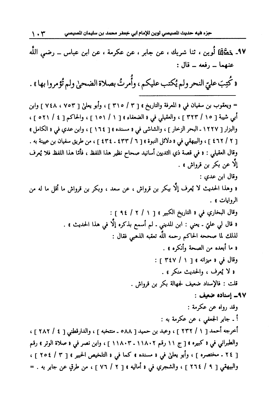 97 - حَدَّثَنَا شَرِيكٌ، عَنْ جَابِرٍ، عَنْ عِكْرِمَةَ، عَنِ ابْنِ عَبَّاسٍ رَفَعَهُ، قَالَ: «§كُتِبَ عَلَيَّ النَّحْرُ فَلَمْ تُكْتَبْ عَلَيْكُمْ، وَأُمِرْتُ بِصَلَاةِ الضُّحَى وَلَمْ تُؤْمَرُوا بِهَا»