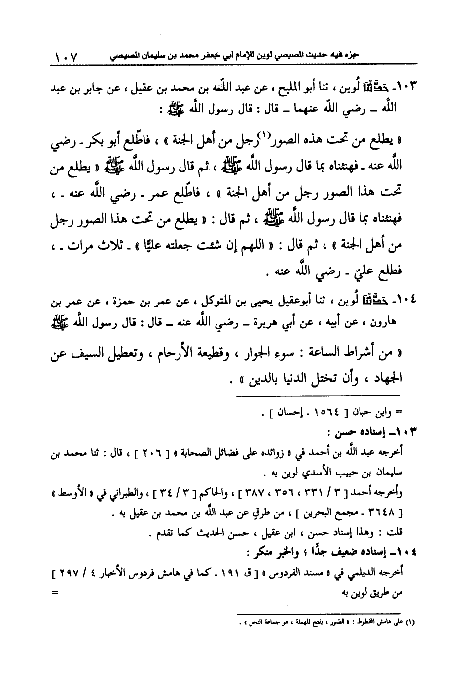 103 - حَدَّثَنَا أَبُو الْمَلِيحِ، عَنْ عَبْدِ اللَّهِ بْنِ مُحَمَّدِ بْنِ عَقِيلٍ، عَنْ جَابِرِ بْنِ عَبْدِ اللَّهِ رَضِيَ اللَّهُ عَنْهُمَا، قَالَ: قَالَ رَسُولُ اللَّهِ صَلَّى اللهُ عَلَيْهِ وَسَلَّمَ: «§يَطْلُعُ مِنْ تَحْتِ هَذِهِ الصَّوْرِ رَجُلٌ مِنْ أَهْلِ الْجَنَّةِ» فَطَلَعَ أَبُو بَكْرٍ رَضِيَ اللَّهُ عَنْهُ , فَهَنَّيْنَاهُ بِمَا قَالَ رَسُولُ اللَّهِ , صَلَّى اللهُ عَلَيْهِ وَسَلَّمَ، ثُمَّ قَالَ رَسُولُ اللَّهِ صَلَّى اللهُ عَلَيْهِ وَسَلَّمَ: «يَطْلُعُ مِنْ تَحْتِ هَذَا الصَّوْرِ رَجُلٌ مِنْ أَهْلِ الْجَنَّةِ» فَطَلَعَ عُمَرُ , فَهَنَّيْنَاهُ بِمَا قَالَ رَسُولُ اللَّهِ صَلَّى اللهُ عَلَيْهِ وَسَلَّمَ، ثُمَّ قَالَ رَسُولُ اللَّهِ صَلَّى اللهُ عَلَيْهِ وَسَلَّمَ: «يَطْلُعُ مِنْ تَحْتِ هَذَا الصَّوْرِ رَجُلٌ مِنْ أَهْلِ الْجَنَّةِ» ثُمَّ قَالَ: «اللَّهُمَّ إِنْ شِئْتَ جَعَلْتَهُ عَلِيًّا» فَطَلَعَ عَلِيُّ رضي الله عنه