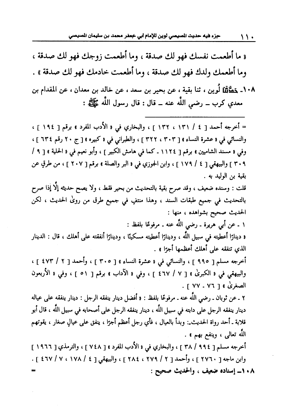 108 - حَدَّثَنَا بَقِيَّةُ، عَنْ بَحِيرِ بْنِ سَعْدٍ، عَنْ خَالِدِ بْنِ مَعْدَانَ، عَنِ الْمِقْدَامِ بْنِ مَعْدِي كَرِبٍ رَضِيَ اللَّهُ عَنْهُ، عَنْ أَبِي أَيُّوبَ رَضِيَ اللَّهُ عَنْهُ قَالَ: قَالَ رَسُولُ اللَّهِ صَلَّى اللهُ عَلَيْهِ وَسَلَّمَ: -[111]- «§كِيلُوا طَعَامَكُمْ يُبَارَكْ لَكُمْ فِيهِ»