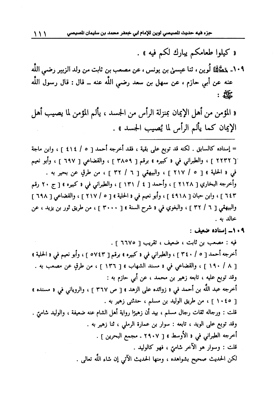 109 - حَدَّثَنَا عِيسَى بْنُ يُونُسَ، عَنْ مُصْعَبِ بْنِ ثَابِتٍ مِنْ وَلَدِ الزُّبَيْرِ رَضِيَ اللَّهُ عَنْهُ , عَنْ أَبِي حَازِمٍ، عَنْ سَهْلِ بْنِ سَعْدٍ رَضِيَ اللَّهُ عَنْهُ، قَالَ: قَالَ رَسُولُ اللَّهِ صَلَّى اللهُ عَلَيْهِ وَسَلَّمَ: «§الْمُؤْمِنُ مِنْ أَهْلِ الْإِيمَانِ بِمَنْزِلَةِ الرَّأْسِ مِنَ الْجَسَدِ، يَأْلَمُ الْمُؤْمِنُ لِمَا يُصِيبُ أَهْلَ الْإِيمَانِ كَمَا يَأْلَمُ الرَّأْسُ لِمَا يُصِيبُ الْجَسَدَ»