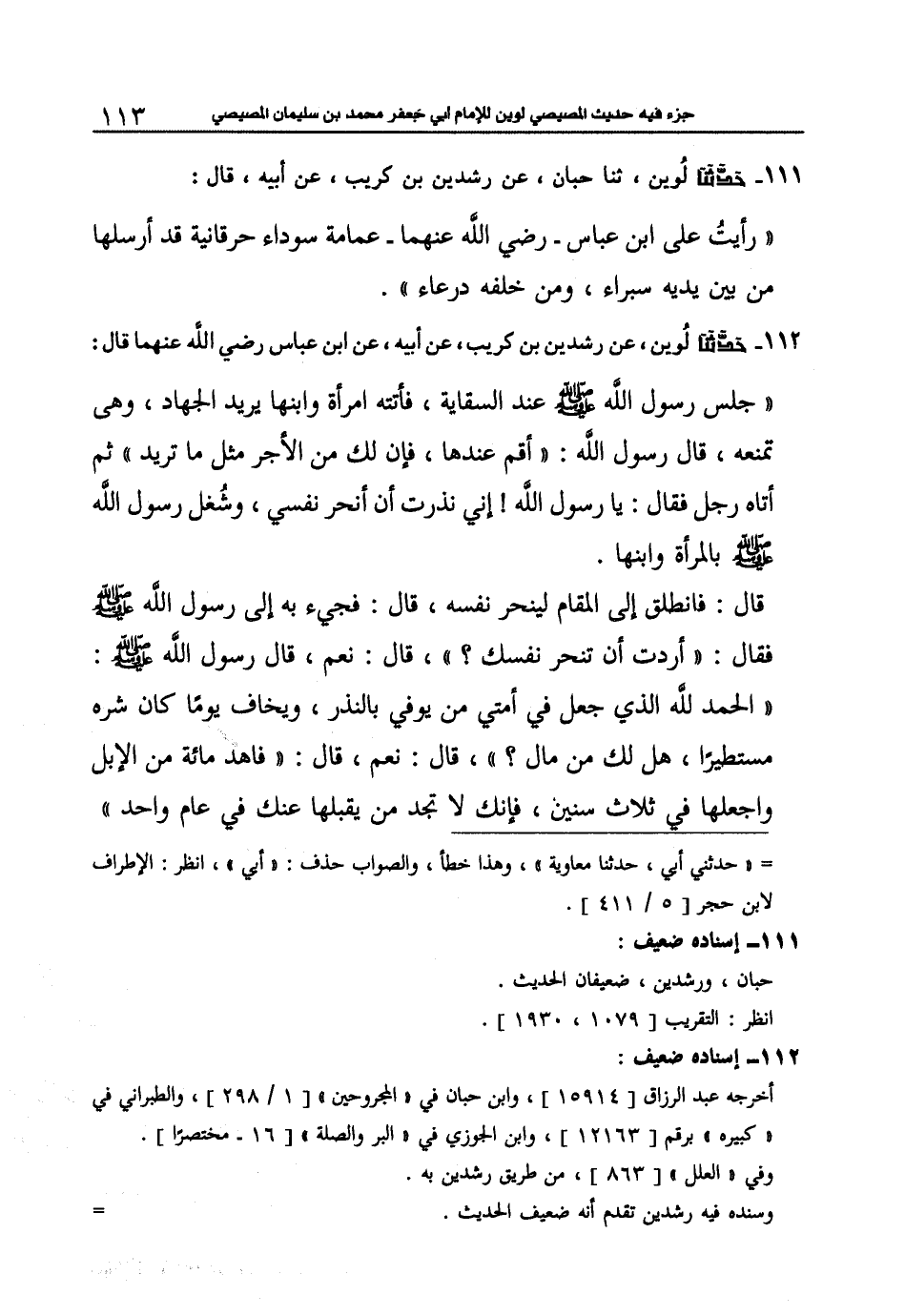 112 - عَنْ رِشْدِينَ بْنِ كُرَيْبٍ، عَنْ أَبِيهِ، عَنِ ابْنِ عَبَّاسٍ رَضِيَ اللَّهُ عَنْهُمَا، قَالَ: جَلَسَ رَسُولُ اللَّهِ صَلَّى اللهُ عَلَيْهِ وَسَلَّمَ عِنْدَ السِّقَايَةِ , فَأَتَتْهُ امْرَأَةٌ وَابْنُهَا وَهُوَ يُرِيدُ الْجِهَادَ وَهِيَ تَمْنَعُهُ. قَالَ رَسُولُ اللَّهِ صَلَّى اللهُ عَلَيْهِ وَسَلَّمَ: «§أَقِمْ عِنْدَهَا فَإِنَّ لَكَ مِنَ الْأَجْرِ مِثْلَ مَا تُرِيدُ» . ثُمَّ أَتَاهُ رَجُلٌ، فَقَالَ: يَا رَسُولَ اللَّهِ، إِنِّي نَذَرْتُ أَنْ أَنْحَرَ نَفْسِي، وَشُغِلَ رَسُولُ اللَّهِ صَلَّى اللهُ عَلَيْهِ وَسَلَّمَ بِالْمَرْأَةِ وَابْنِهَا. قَالَ: فَانْطَلَقَ إِلَى الْمَقَامِ لِيَنْحَرَ نَفْسَهُ، قَالَ: فَجِيءَ بِهِ إِلَى رَسُولِ اللَّهِ صَلَّى اللهُ عَلَيْهِ وَسَلَّمَ، فَقَالَ: «أَرَدْتَ أَنْ تَنْحَرَ نَفْسَكَ» ؟ قَالَ: نَعَمْ قَالَ رَسُولُ اللَّهِ صَلَّى اللهُ عَلَيْهِ وَسَلَّمَ: «الْحَمْدُ لِلَّهِ الَّذِي جَعَلَ فِي أُمَّتِي مَنْ يُوفِّي بِالنَّذْرِ وَيَخَافُ يَوْمًا كَانَ شَرُّهُ مُسْتَطِيرًا، هَلْ لَكَ مِنْ مَالٍ» ؟ قَالَ: نَعَمْ، قَالَ: «فَأَهْدِ مِائَةً مِنَ الْإِبِلِ، وَاجْعَلْهَا فِي ثَلَاثِ سِنِينَ، فَإِنَّكَ لَا تَجِدُ مَنْ يَقْبَلُهَا عَنْكَ فِي عَامٍ وَاحِدٍ» . -[114]- ثُمَّ أَقْبَلَ عَلَى الْمَرْأَةِ وَابْنِهَا قَالَ: «أَقِمْ عِنْدَهَا، فَإِنَّ لَكَ مِنَ الْأَجْرِ عِنْدَهَا مِثْلَمَا تُرِيدُ» . قَالَ: وَجَاءَتْهُ امْرَأَةٌ فِي مَجْلِسِهِ ذَلِكَ، فَقَالَتْ: إِنِّي وَافِدَةُ النِّسَاءِ إِلَيْكَ، وَاللَّهِ مَا مِنَ امْرَأَةٍ سَمِعَتْ بِمَخْرَجِي أَوْ لَمْ تَسْمَعْ إِلَّا وَهِيَ تَهْوَى مَقَالَتِي، اللَّهُ رَبُّ الرِّجَالِ وَالنِّسَاءِ، وَآدَمُ أَبُو الرِّجَالِ وَالنِّسَاءِ، وَأَنْتَ رَسُولُ اللَّهِ إِلَى الرِّجَالِ وَالنِّسَاءِ، كَتَبَ اللَّهُ عَزَّ وَجَلَّ الْجِهَادَ عَلَى الرِّجَالِ، فَإِنْ أَصَابُوا أُجِرُوا، وَإِنْ مَاتُوا وَقَعَ أَجْرُهُمْ عَلَى اللَّهِ عَزَّ وَجَلَّ؛ وَإِنِ اسْتُشْهِدُوا كَانُوا أَحْيَاءً عِنْدَ رَبِّهِمْ يُرْزَقُونَ، وَنَحْنُ نَقُومُ عَلَيْهِمْ، وَنَحُسُّ لِدَوَابِّهِمْ وَلَيْسَ لَنَا شَيْءٌ مِنْ ذَلِكَ، فَقَالَ رَسُولُ اللَّهِ صَلَّى اللهُ عَلَيْهِ وَسَلَّمَ: «فَأَبْلِغِي مَنْ لَقِيتِ مِنَ النِّسَاءِ أَنَّ طَاعَةَ الزَّوْجِ وَاعْتِرَافًا بِحَقِّهِ يَعْدِلُ ذَلِكَ كُلَّهُ، وَقَلِيلٌ مِنْكُنَّ مَنْ تَفْعَلُ ذَلِكَ»