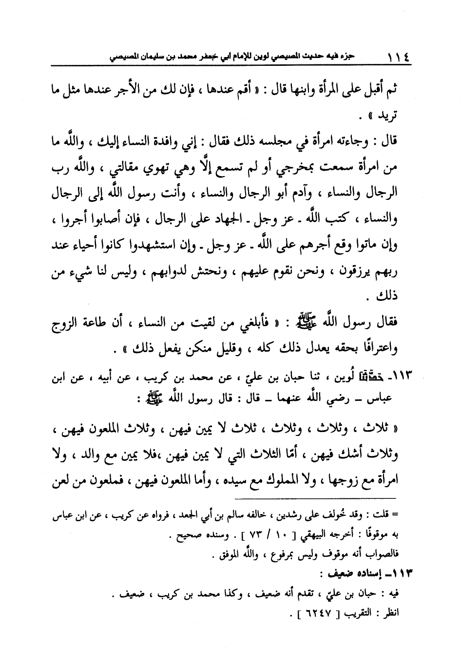113 - حَدَّثَنَا حَبَّانُ بْنُ عَلِيٍّ، عَنْ مُحَمَّدِ بْنِ كُرَيْبٍ، عَنْ أَبِيهِ، عَنِ ابْنِ عَبَّاسٍ رَضِيَ اللَّهُ عَنْهُمَا، قَالَ: قَالَ رَسُولُ اللَّهِ صَلَّى اللهُ عَلَيْهِ وَسَلَّمَ: " §ثَلَاثٌ، وَثَلَاثٌ، وَثَلَاثٌ: ثَلَاثٌ لَا يَمِينَ فِيهِنَّ، وَثَلَاثٌ الْمَلْعُونُ فِيهِنَّ، وَثَلَاثٌ أَشُكُّ فِيهِنَّ، أَمَّا الثَّلَاثُ الَّتِي لَا يَمِينَ فِيهِنَّ: فَلَا يَمِينَ مَعَ وَالِدٍ، وَلَا الْمْرَأَةٍ مَعَ زَوْجِهَا، وَلَا الْمَمْلُوكِ مَعَ سَيِّدِهِ، وَأَمَّا الْمَلْعُونُ فِيهِنَّ: فَمَلْعُونٌ مَنْ لَعَنَ -[115]- وَالِدَيْهِ، وَمَلْعُونٌ مَنْ ذَبَحَ لِغَيْرِ اللَّهِ، وَمَلْعُونٌ مَنْ غَيَّرَ تُخُومَ الْأَرْضِ، وَأَمَّا الَّتِي أَشُكُّ فِيهِنَّ: فَعُزَيْرٌ , لَا أَدْرِي أَكَانَ نَبِيًّا أُمْ لَا؟ وَلَا أَدْرِي أَلَعَنَ تُبَّعًا أَمْ لَا؟ " قَالَ: وَنَسِيتُ - يَعْنِي: - الثَّالِثَةَ