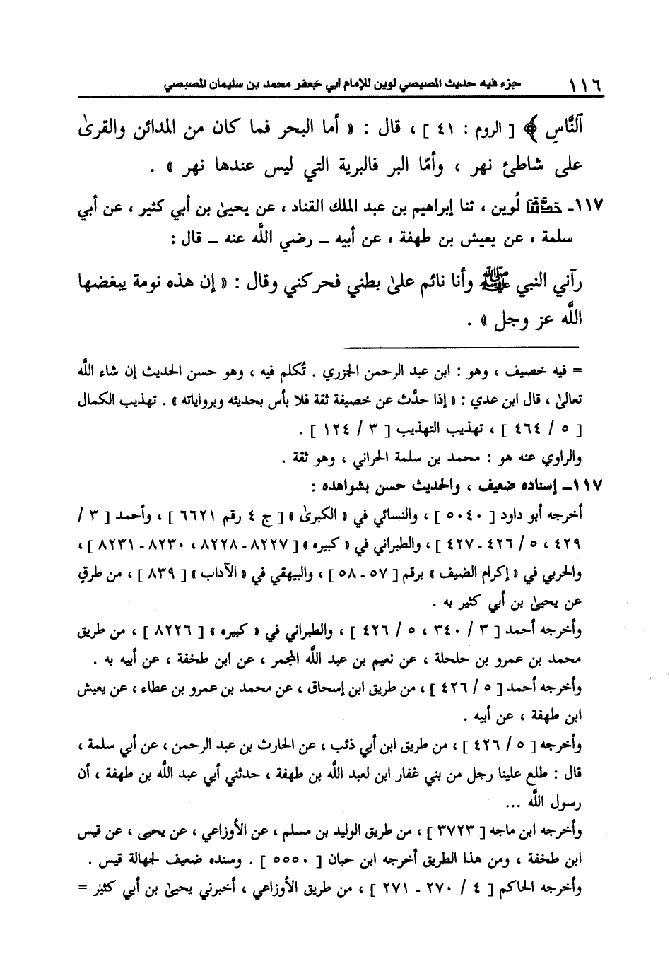 117 - حَدَّثَنَا إِبْرَاهِيمُ بْنُ عَبْدِ الْمَلِكِ الْقَنَّادُ، عَنْ يَحْيَى بْنِ أَبِي كَثِيرٍ، عَنْ أَبِي سَلَمَةَ، عَنْ يَعِيشَ بْنِ طِهْفَةَ، عَنْ أبيه رَضِيَ اللَّهُ عَنْهُ، قَالَ: رَآنِي النَّبِيُّ صَلَّى اللهُ عَلَيْهِ وَسَلَّمَ وَأَنَا نَائِمٌ عَلَى بَطْنِي فَحَرَّكَنِي، وَقَالَ: «إِنَّ §هَذِهِ نَوْمَةٌ يُبْغِضُهَا اللَّهُ عَزَّ وَجَلَّ»