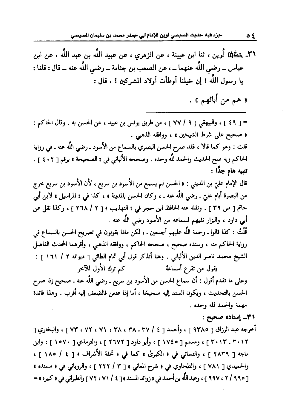 31 - أَخْبَرَنَا ابْنُ عُيَيْنَةَ، عَنِ الزُّهْرِيِّ، عَنْ عُبَيْدِ اللَّهِ بْنِ عَبْدِ اللَّهِ، عَنِ ابْنِ عَبَّاسٍ رَضِيَ اللَّهُ عَنْهُمَا، عَنِ الصَّعْبِ بْنِ جَثَّامَةَ رَضِيَ اللَّهُ عَنْهُ، قَالَ: قُلْنَا: يَا رَسُولَ اللَّهِ إِنَّ خَيْلَنَا أَوْطَئَتْ أَوْلَادَ الْمُشْرِكِينَ. قَالَ: «§هُمْ مِنْ آبَائِهِمْ»