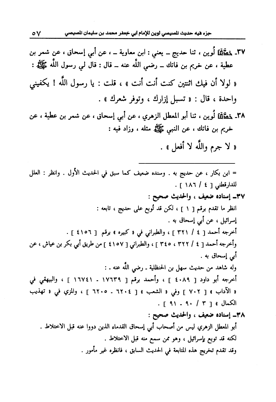 37 - حَدَّثَنَا حُدَيْجٌ، يَعْنِي ابْنَ مُعَاوِيَةَ , عَنْ أَبِي إِسْحَاقَ، عَنْ شِمْرِ بْنِ عَطِيَّةَ، عَنْ خُرَيْمِ بْنِ فَاتِكٍ رَضِيَ اللَّهُ عَنْهُ: قَالَ لِي رَسُولُ , اللَّهِ صَلَّى اللهُ عَلَيْهِ وَسَلَّمَ ,: «لَوْلَا أَنَّ فِيكَ اثْنَتَيْنِ كُنْتَ أَنْتَ أَنْتَ» . قُلْتُ: يَا رَسُولَ اللَّهِ، يَكْفِينِي وَاحِدَةٌ. قَالَ: «§تُسْبِلُ إِزَارَكَ وَتُوَفِّرُ شَعْرَكَ»