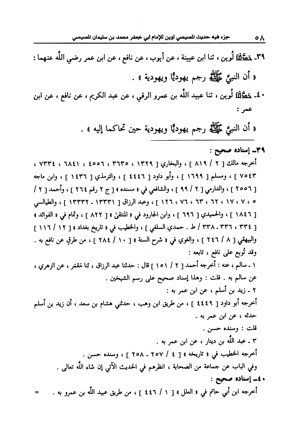 40 - حَدَّثَنَا عُبَيْدُ اللَّهِ بْنُ عَمْرٍو الرَّقِّيُّ، عَنْ عَبْدِ الْكَرِيمِ، عَنْ نَافِعٍ، عَنِ ابْنِ عُمَرَ أَنَّ النَّبِيَّ صَلَّى اللهُ عَلَيْهِ وَسَلَّمَ §رَجَمَ يَهُودِيًّا وَيَهُودِيَّةً حِينَ تَحَاكَمَا إِلَيْهِ