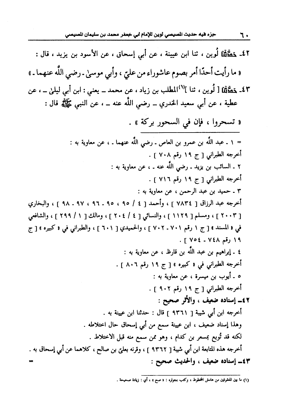 43 - حَدَّثَنَا الْمُطَّلِبُ بْنُ زِيَادٍ، عَنْ مُحَمَّدٍ، يَعْنِي ابْنَ أَبِي لَيْلَى، عَنْ عَطِيَّةَ، عَنْ أَبِي سَعِيدٍ الْخُدْرِيِّ رَضِيَ اللَّهُ عَنْهُمَا عَنِ النَّبِيِّ صَلَّى اللهُ عَلَيْهِ وَسَلَّمَ قَالَ: «§تَسَحَّرُوا، فَإِنَّ فِي السُّحُورِ بَرَكَةٌ»