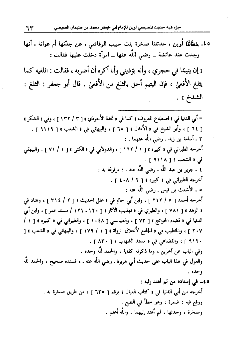 45 - حَدَّثَتْنَا صَخْرَةُ بِنْتُ حَبِيبٍ الرَّقَاشِيُّ، عَنْ جَدَّتِهَا أُمِّ عَوَانَةَ، أَنَّهَا وَجَدَتْ عِنْدَ عَائِشَةَ , رَضِيَ اللَّهُ عَنْهَا امْرَأَةً دَخَلَتْ عَلَيْهَا، فَقَالَتْ: إِنَّ يَتِيمًا فِي حِجْرِي، وَإِنَّهُ يُؤْذِينِي، وَأَنَا أَكْرَهُ أَنْ أَضْرِبَهُ. فَقَالَتْ: «§اثْلَغِيهِ كَمَا يُثْلَغُ الْأَفْعَى، فَإِنَّ الْيَتِيمَ أَحَقُّ بِالثَّلْغِ مِنَ الْأَفْعَى» قَالَ أَبُو جَعْفَرٍ: الثَّلْغُ: الشَّدْخُ