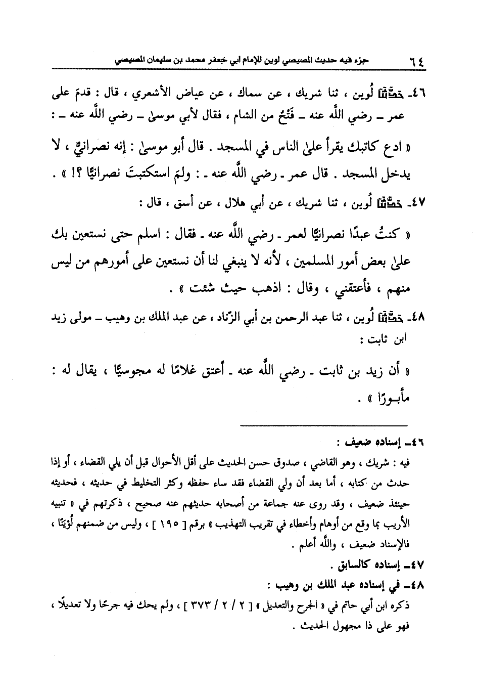 46 - حَدَّثَنَا شَرِيكٌ، عَنْ سِمَاكٍ، عَنْ عِيَاضٍ الْأَشْعَرِيِّ، قَالَ: قَدِمَ عَلَى عُمَرَ رَضِيَ اللَّهُ عَنْهُ فَتْحٌ مِنَ الشَّامِ، فَقَالَ لِأَبِي مُوسَى رَضِيَ اللَّهُ عَنْهُ: §ادْعُ كَاتِبَكَ يَقْرَأُ عَلَى النَّاسِ فِي الْمَسْجِدِ. قَالَ أَبُو مُوسَى: إِنَّهُ نَصْرَانِيُّ , لَا يَدْخُلُ الْمَسْجِدَ. قَالَ عُمَرُ رَضِيَ اللَّهُ عَنْهُ: وَلِمَ اسْتَكْتَبْتَ نَصْرَانِيًّا؟
