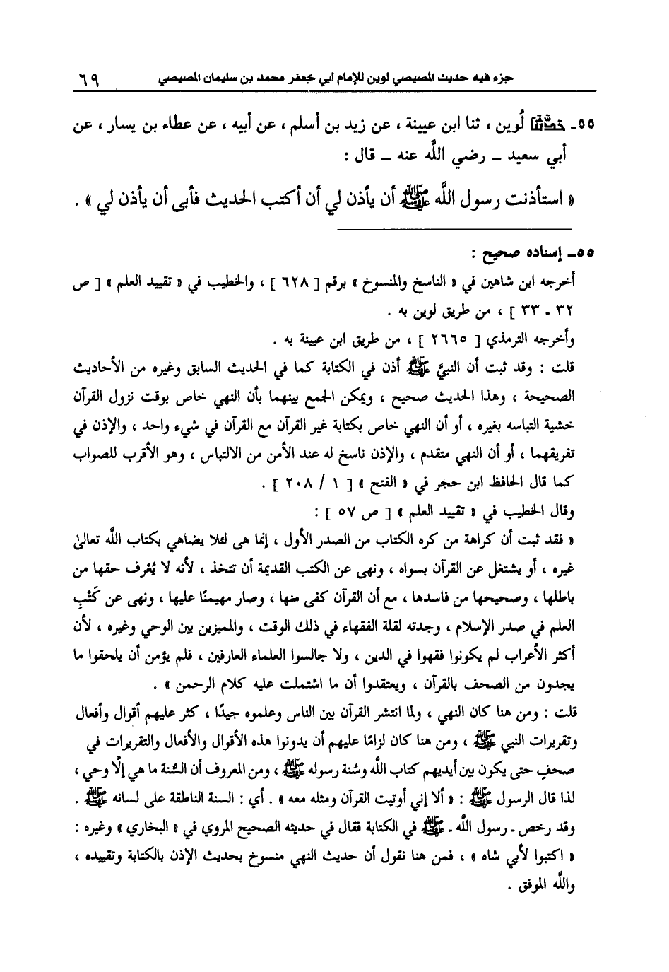 55 - حَدَّثَنَا ابْنُ عُيَيْنَةَ، عَنِ ابْنِ زَيْدِ بْنِ أَسْلَمَ، عَنْ أَبِيهِ، عَنْ عَطَاءِ بْنِ يَسَارٍ، عَنْ أَبِي سَعِيدٍ الْخُدْرِيِّ رَضِيَ اللَّهُ عَنْهُ، قَالَ: §اسْتَأْذَنْتُ رَسُولَ اللَّهِ صَلَّى اللهُ عَلَيْهِ وَسَلَّمَ أَنْ يَأْذَنَ لِي أَنْ أَكْتُبَ الْحَدِيثَ فَأَبَى أَنْ يَأْذَنَ لِي