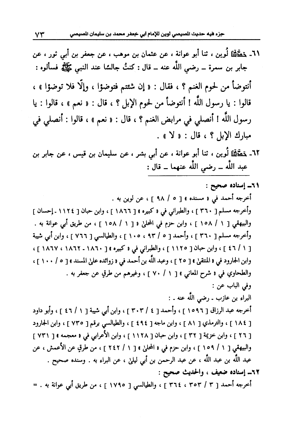 61 - حَدَّثَنَا أَبُو عَوَانَةَ، عَنْ عُثْمَانَ بْنِ أَبِي وَهْبٍ، عَنْ جَعْفَرِ بْنِ أَبِي ثَوْرٍ، عَنْ جَابِرِ بْنِ سَمُرَةَ رَضِيَ اللَّهُ عَنْهُ قَالَ: كُنْتُ جَالِسًا عِنْدَ النَّبِيِّ صَلَّى اللهُ عَلَيْهِ وَسَلَّمَ فَسَأَلُوهُ أَنَتَوَضَّأُ مِنْ لُحُومِ الْغَنَمِ؟ . فَقَالَ: «§إِنْ شِئْتُمْ فَتَوَضَّئُوا وَإِلَّا فَلَا تَتَوَضَّئُوا» قَالُوا: يَا رَسُولَ اللَّهِ، أَنَتَوَضَّأُ مِنْ لُحُومِ الْإِبِلِ؟ . قَالَ: «نَعَمْ» . قَالُوا: يَا رَسُولَ اللَّهِ، أَنُصَلِّي فِي مَرَابِضِ الْغَنَمِ؟ قَالَ: «نَعَمْ» . قَالُوا أَنُصَلِّي فِي مَبَارِكِ الْإِبِلِ؟ . قَالَ: «لَا»