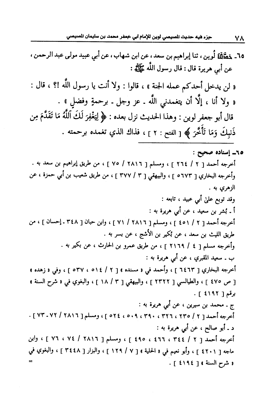 65 - حَدَّثَنَا إِبْرَاهِيمُ بْنُ سَعْدٍ، عَنِ ابْنِ شِهَابٍ، عَنْ أَبِي عُبَيْدٍ، مَوْلَى عَبْدِ الرَّحْمَنِ، عَنْ أَبِي هُرَيْرَةَ , قَالَ: قَالَ رَسُولُ اللَّهِ صَلَّى اللهُ عَلَيْهِ وَسَلَّمَ: «§لَنْ يُدْخِلَ أَحَدَكُمْ عَمَلُهُ الْجَنَّةَ» قَالُوا: وَلَا أَنْتَ يَا رَسُولَ اللَّهِ؟ قَالَ: «وَلَا أَنَا، إِلَّا أَنْ يَتَغَمَّدَنِي اللَّهُ مِنْهُ بِرَحْمَةٍ وَفَضْلٍ» قَالَ أَبُو جَعْفَرٍ لُوَيْنٌ: وَهَذَا الْحَدِيثُ نَزَلَ بَعْدَهُ: {لِيَغْفِرَ لَكَ اللَّهُ مَا تَقَدَّمَ مِنْ ذَنْبِكَ وَمَا تَأَخَّرَ} [الفتح: 2] فَذَاكَ الَّذِي تَغَمَّدَهُ بِرَحْمَتِهِ