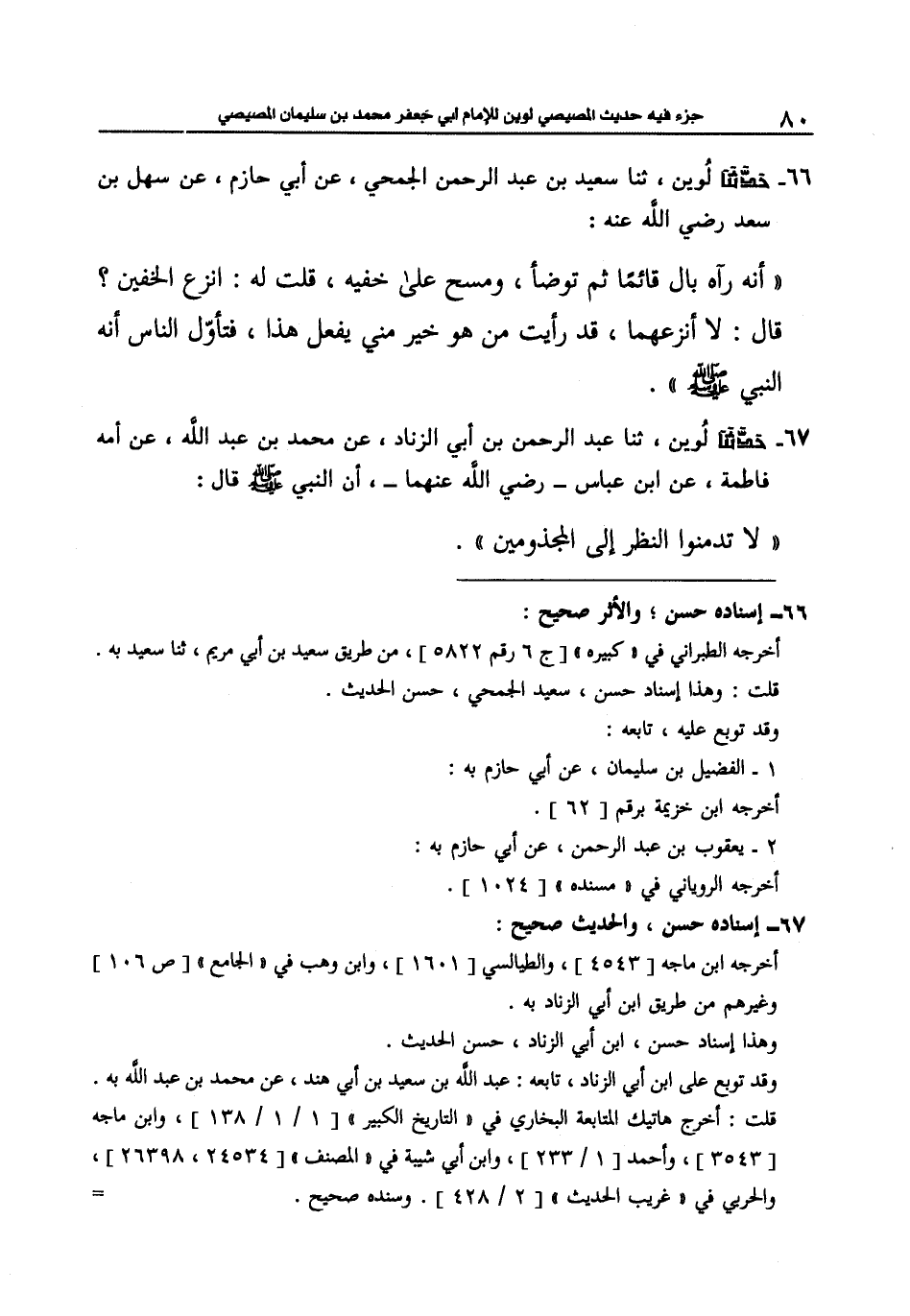 66 - حَدَّثَنَا سَعِيدُ بْنُ عَبْدِ الرَّحْمَنِ الْجُمَحِيُّ، عَنْ أَبِي حَازِمٍ، عَنْ سَهْلِ بْنِ سَعْدٍ أَنَّهُ §رَآهُ بَالَ قَائِمًا، ثُمَّ تَوَضَّأَ وَمَسَحَ عَلَى خُفَّيْهِ، قُلْتُ لَهُ: انْزَعِ الْخُفَّيْنِ قَالَ: لَا أَنْزِعُهُمَا، قَدْ رَأَيْتُ مَنْ هُوَ خَيْرٌ مِنِّي يَفْعَلُ هَذَا. فَتَأَوَّلَ النَّاسُ أَنَّهُ رَسُولُ اللَّهِ صَلَّى اللهُ عَلَيْهِ وَسَلَّمَ