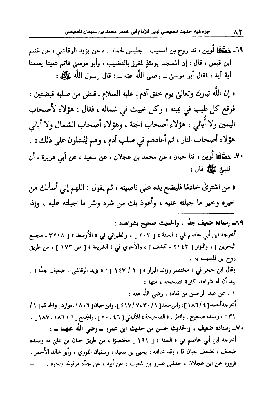 69 - حَدَّثَنَا رَوْحُ بْنُ الْمُسَيَّبِ، جَلِيسٌ لِحَمَّادٍ , عَنْ يَزِيدَ الرَّقَاشِيِّ، عَنْ غُنَيْمِ بْنِ قَيْسٍ عَنْ أَبِي مُوسَى، عَنِ النَّبِيِّ صَلَّى اللهُ عَلَيْهِ وَسَلَّمَ، قَالَ: «إِنَّ §الْمَسْجِدَ يَوْمَئِذٍ لَمُغَرَّزٌ بِالْقَصَبِ» وَأَبُو مُوسَى قَائِمٌ عَلَيْنَا يُعَلِّمُنَا آيَةً آيَةً، فَقَالَ أَبُو مُوسَى: قَالَ رَسُولُ اللَّهِ صَلَّى اللهُ عَلَيْهِ وَسَلَّمَ: " إِنَّ اللَّهَ يَوْمَ خَلَقَ آدَمَ قَبَضَ مِنْ صُلْبِهِ قَبْضَتَيْنِ، فَوَقَعَ كُلُّ طَيِّبٍ فِي يَمِينِهِ، وَكُلُّ خَبِيثٍ فِي شِمَالِهِ , فَقَالَ: هَؤُلَاءِ أَصْحَابُ الْيَمِينِ، وَلَا أُبَالِي، هَؤُلَاءِ أَصْحَابُ الْجَنَّةِ، وَهَؤُلَاءِ أَصْحَابُ الشِّمَالِ وَلَا أُبَالِي، هَؤُلَاءِ أَصْحَابُ النَّارِ، ثُمَّ أَعَادَهُمْ فِي صُلْبِ آدَمَ، فَهُمْ يَنْسِلُونَ عَلَى ذَلِكَ "
