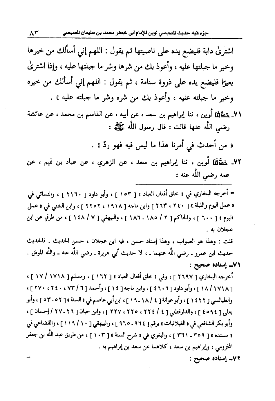 71 - حَدَّثَنَا إِبْرَاهِيمُ بْنُ سَعْدٍ، عَنْ أَبِيهِ، عَنِ الْقَاسِمِ بْنِ مُحَمَّدٍ، عَنْ عَائِشَةَ رَضِيَ اللَّهُ عَنْهَا قَالَتْ: قَالَ رَسُولُ اللَّهِ صَلَّى اللهُ عَلَيْهِ وَسَلَّمَ: «§مَنْ أَحْدَثَ فِي دِينِنَا مَا لَيْسَ فِيهِ فَهُوَ رَدٌّ»