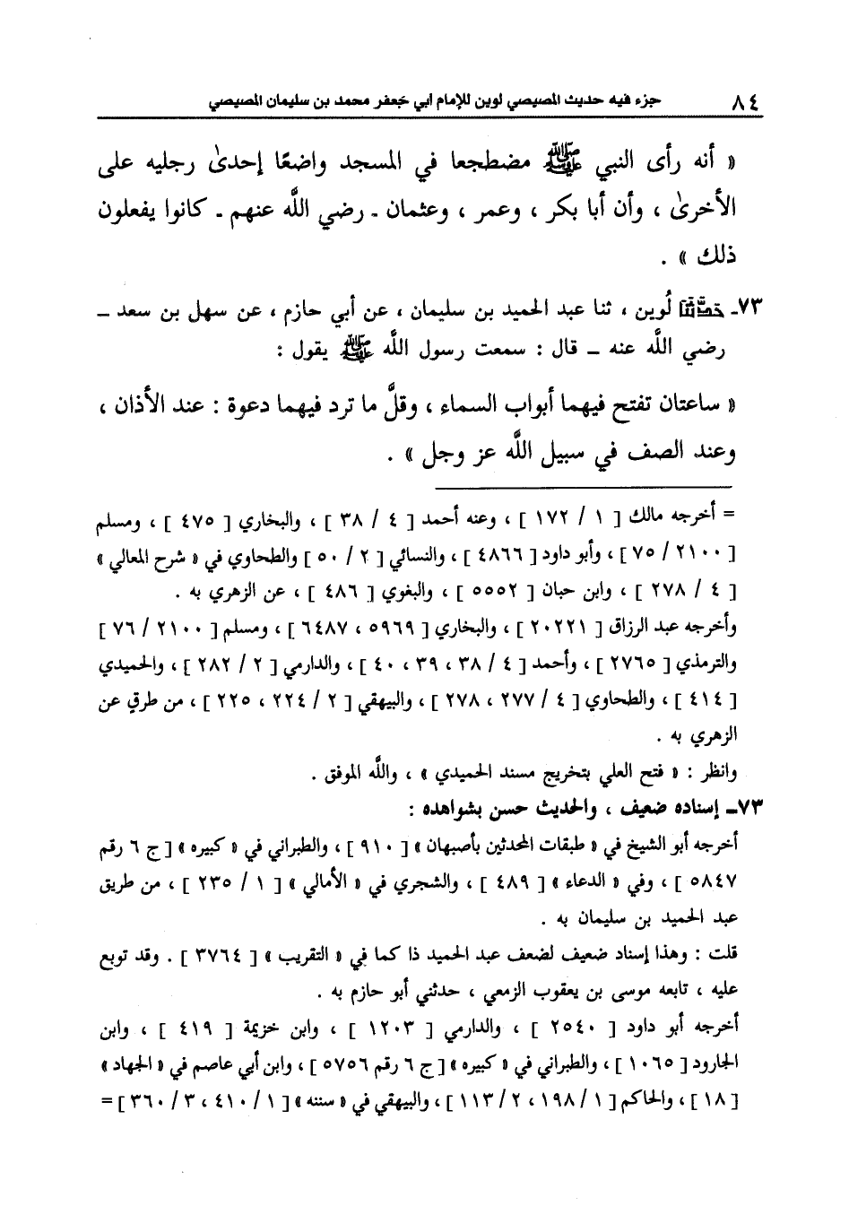 73 - حَدَّثَنَا عَبْدُ الْحَمِيدِ بْنُ سُلَيْمَانَ، عَنْ أَبِي حَازِمٍ، عَنْ سَهْلِ بْنِ سَعْدٍ رَضِيَ اللَّهُ عَنْهُ، قَالَ: سَمِعْتُ رَسُولَ اللَّهِ صَلَّى اللهُ عَلَيْهِ وَسَلَّمَ يَقُولُ: " §سَاعَتَانِ تُفْتَحُ فِيهِمَا أَبْوَابُ السَّمَاءِ، وَقَلَّمَا تُرَدُّ فِيهِمَا دَعْوَةٌ: عِنْدَ الْأَذَانِ، وَعِنْدَ الصَّفِّ فِي سَبِيلِ اللَّهِ عَزَّ وَجَلَّ "