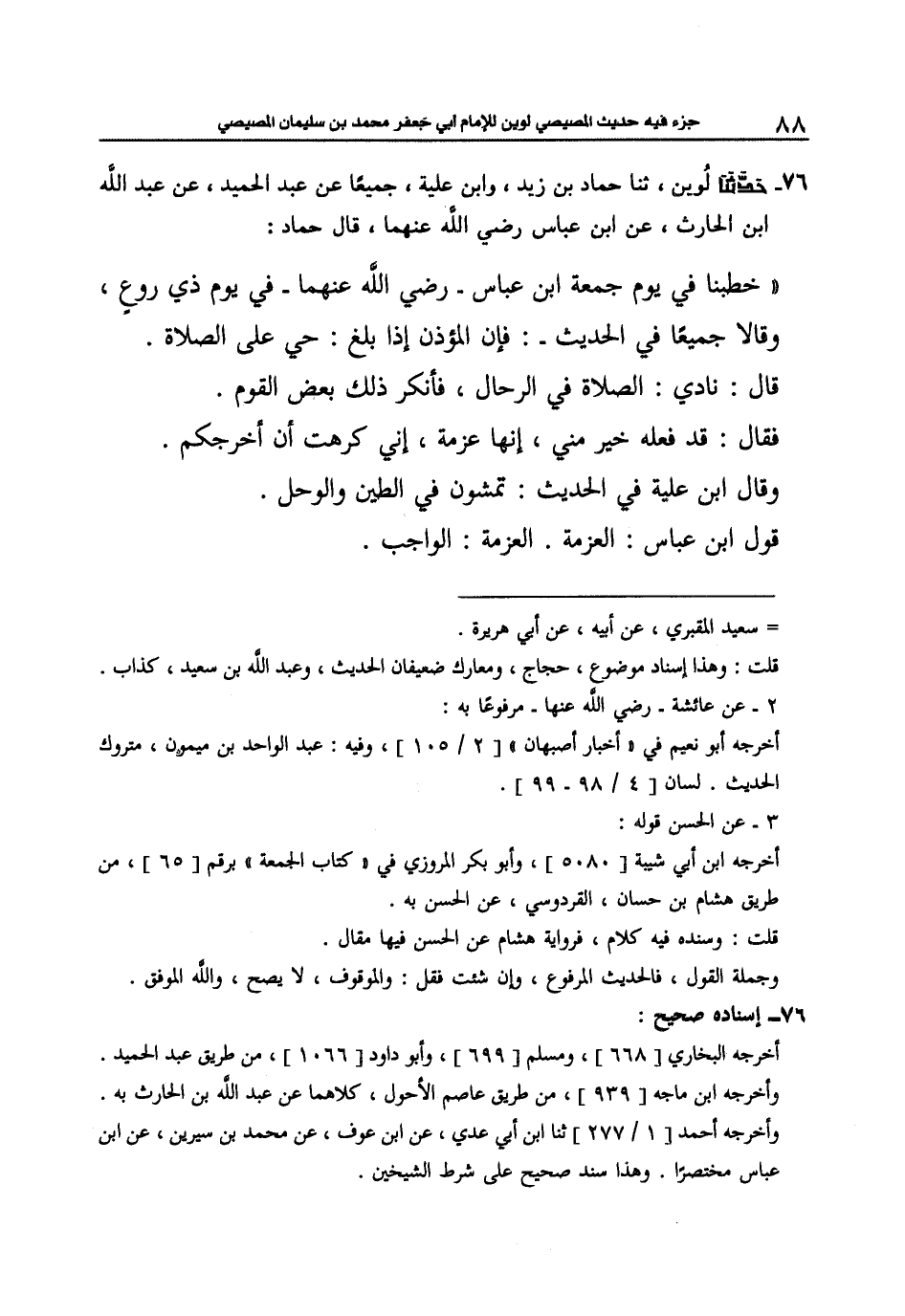 76 - حَدَّثَنَا حَمَّادُ بْنُ زَيْدٍ، وَابْنُ عُلَيَّةَ جَمِيعًا، عَنْ عَبْدِ الْحَمِيدِ، عَنْ عَبْدِ اللَّهِ بْنِ الْحَارِثِ، عَنِ ابْنِ عَبَّاسٍ رَضِيَ اللَّهُ عَنْهُمَا، قَالَ حَمَّادٌ: خَطَبَنَا فِي يَوْمِ جُمُعَةٍ ابْنُ عَبَّاسٍ , رَضِيَ اللَّهُ عَنْهُمَا , فِي يَوْمٍ ذِي رَدْغٍ. وَقَالَا جَمِيعًا فِي الْحَدِيثِ: فَإِنَّ §الْمُؤَذِّنَ إِذَا بَلَغَ حَيَّ عَلَى الصَّلَاةِ. قَالَ: نَادَى: الصَّلَاةُ فِي الرِّحَالِ، فَأَنْكَرَ ذَلِكَ بَعْضُ الْقَوْمِ، فَقَالَ: قَدْ فَعَلَهُ خَيْرٌ مِنِّي، إِنَّهَا عَزْمَةٌ، إِنِّي كَرِهْتُ أَنْ أُحْرِجَكُمْ " وَقَالَ ابْنُ عُلَيَّةَ فِي الْحَدِيثِ: يَمْشُونَ فِي الطِّينِ وَالْوَحَلِ. قَوْلُ ابْنِ عَبَّاسٍ: عَزْمَةٌ، الْعَزْمَةُ الْوَاجِبُ