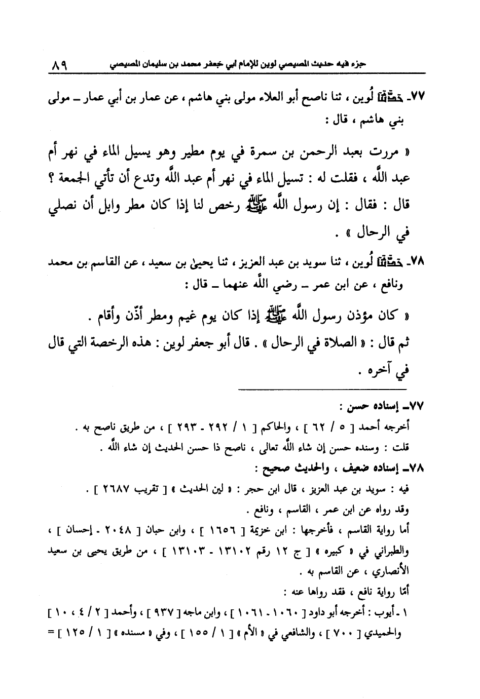 77 - حَدَّثَنَا نَاصِحٌ أَبُو الْعَلَاءِ، مَوْلَى بَنِي هَاشِمٍ، عَنْ عَمَّارِ بْنِ أَبِي عَمَّارٍ , مَوْلَى بَنِي هَاشِمٍ , قَالَ: مَرَرْتُ بِعَبْدِ الرَّحْمَنِ بْنِ سَمُرَةَ فِي يَوْمٍ مَطِيرٍ، وَهُوَ يُسَيِّلُ الْمَاءَ فِي نَهَرِ أُمِّ عَبْدِ اللَّهِ، فَقُلْتُ لَهُ: تُسَيِّلُ الْمَاءَ فِي نَهَرِ أُمِّ عَبْدِ اللَّهِ , وَتَدَعُ أَنْ تَأْتِيَ لِلْجُمُعَةِ. قَالَ: فَقَالَ: إِنَّ رَسُولَ اللَّهِ صَلَّى اللهُ عَلَيْهِ وَسَلَّمَ , «§رَخَّصَ لَنَا إِذَا كَانَ مَطَرٌ وَابِلٌ أَنْ نُصَلِّيَ فِي الرِّحَالِ»