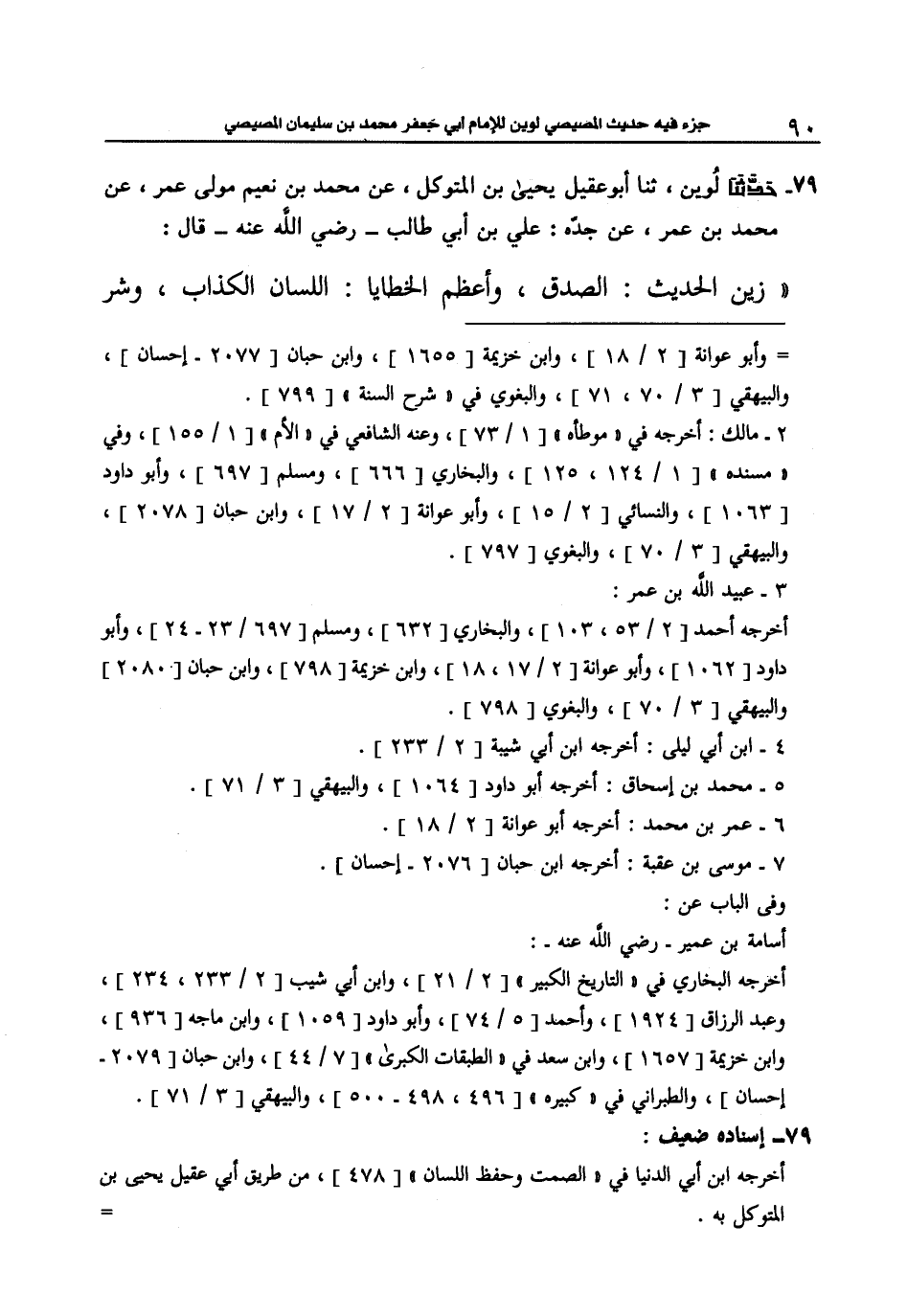 79 - حَدَّثَنَا أَبُو عَقِيلٍ يَحْيَى بْنُ الْمُتَوَكِّلِ، عَنْ مُحَمَّدِ بْنِ نُعَيْمٍ، مَوْلَى عُمَرَ، عَنْ مُحَمَّدِ بْنِ عُمَرَ، عَنْ جَدِّهِ عَلِيِّ بْنِ أَبِي طَالِبٍ رَضِيَ اللَّهُ عَنْهُ، قَالَ: §زَيْنُ الْحَدِيثِ الصِّدْقُ، وَأَعْظَمُ الْخَطَايَا اللِّسَانُ الْكَذَّابُ، وَشَرُّ -[91]- الْعِدَةِ، يَعْنِي: عِدَةَ أَحَدِكُمْ نَفْسَهُ حَتَّى يَأْتِيَهُ الْمَوْتُ، فَذَاكَ الَّذِي يَلُومُ اللَّهُ عَزَّ وَجَلَّ عَلَيْهِ