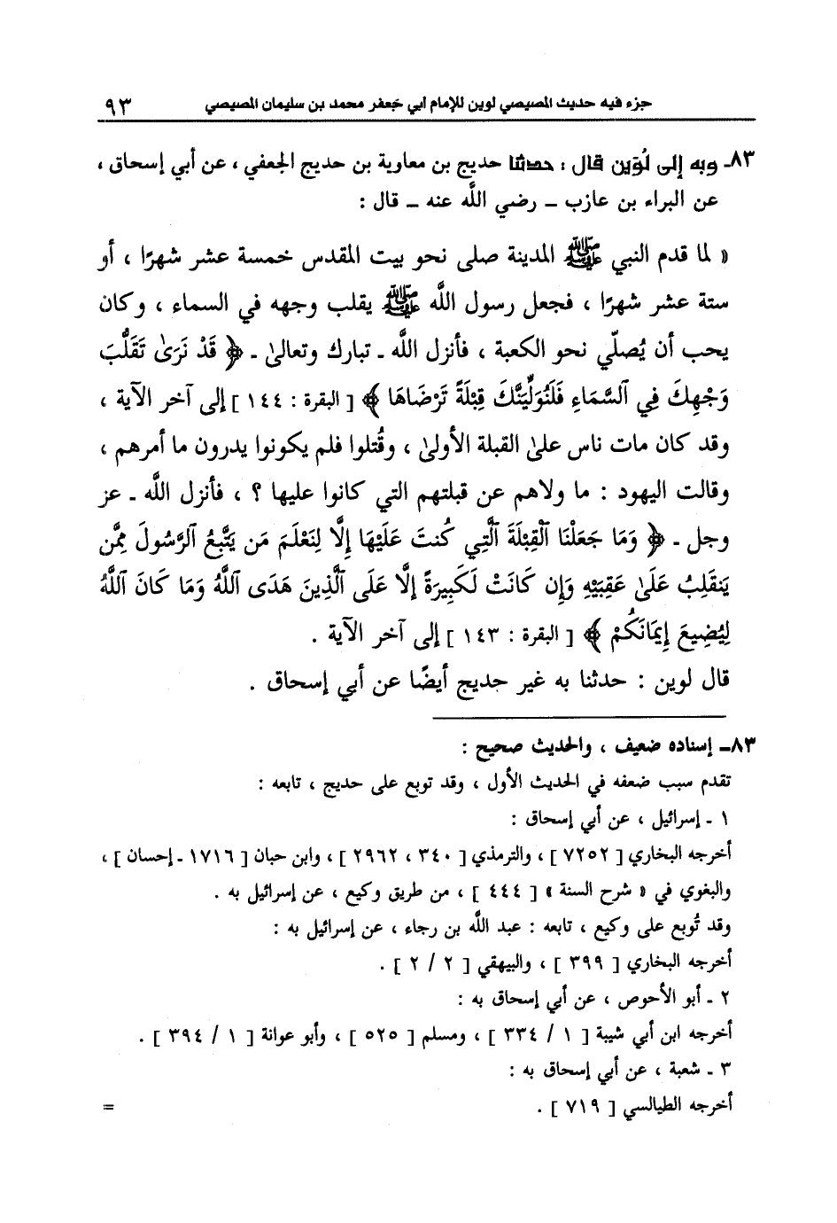 83 - حَدَّثَنَا حُدَيْجُ بْنُ مُعَاوِيَةَ بْنِ حُدَيْجٍ الْجُعْفِيُّ، عَنْ أَبِي إِسْحَاقَ، عَنِ الْبَرَاءِ بْنِ عَازِبٍ رَضِيَ اللَّهُ عَنْهُما، قَالَ: لَمَّا قَدِمَ النَّبِيُّ صَلَّى اللهُ عَلَيْهِ وَسَلَّمَ الْمَدِينَةَ " §صَلَّى نَحْوَ بَيْتِ الْمَقْدِسِ خَمْسَةَ عَشَرَ شَهْرًا أَوْ سِتَّةَ عَشَرَ شَهْرًا فَجَعَلَ رَسُولُ اللَّهِ صَلَّى اللهُ عَلَيْهِ وَسَلَّمَ يُقَلِّبُ وَجْهَهُ فِي السَّمَاءِ، وَكَانَ يُحِبُّ أَنْ يُصَلِّيَ نَحْوَ الْكَعْبَةِ، فَأَنْزَلَ اللَّهُ تَبَارَكَ وَتَعَالَى {قَدْ نَرَى تَقَلُّبَ وَجْهِكَ فِي السَّمَاءِ فَلَنُوَلِّيَنَّكَ قِبْلَةً تَرْضَاهَا.} [البقرة: 144] إِلَى آخِرِ الْآيَةِ. وَقَدْ كَانَ مَاتَ نَاسٌ عَلَى الْقِبْلَةِ الْأُولَى وَقُتِلُوا، فَلَمْ يَكُونُوا يَدْرُونَ مَا أَمُرَهُمْ، فَقَالَتِ الْيَهُودُ: مَا وَلَّاهُمْ عَنْ قِبْلَتِهِمُ الَّتِي كَانُوا عَلَيْهَا؟ . فَأَنْزَلَ اللَّهُ: {وَمَا جَعَلْنَا الْقِبْلَةَ الَّتِي كُنْتَ عَلَيْهَا إِلَّا لِنَعْلَمَ مَنْ يَتَّبِعُ الرَّسُولَ مِمَّنْ يَنْقَلِبُ عَلَى عَقِبَيْهِ وَإِنْ كَانَتْ لَكَبِيرَةً إِلَّا عَلَى الَّذِينَ هَدَى اللَّهُ وَمَا كَانَ اللَّهُ لِيُضِيعَ إِيمَانَكُمْ. . .} [البقرة: 143] إِلَى آخِرِ الْآيَةِ " قَالَ لُوَيْنٌ: حَدَّثَنَا بِهِ غَيْرُ حُدَيْجٍ أَيْضًا، عَنْ أَبِي إِسْحَاقَ